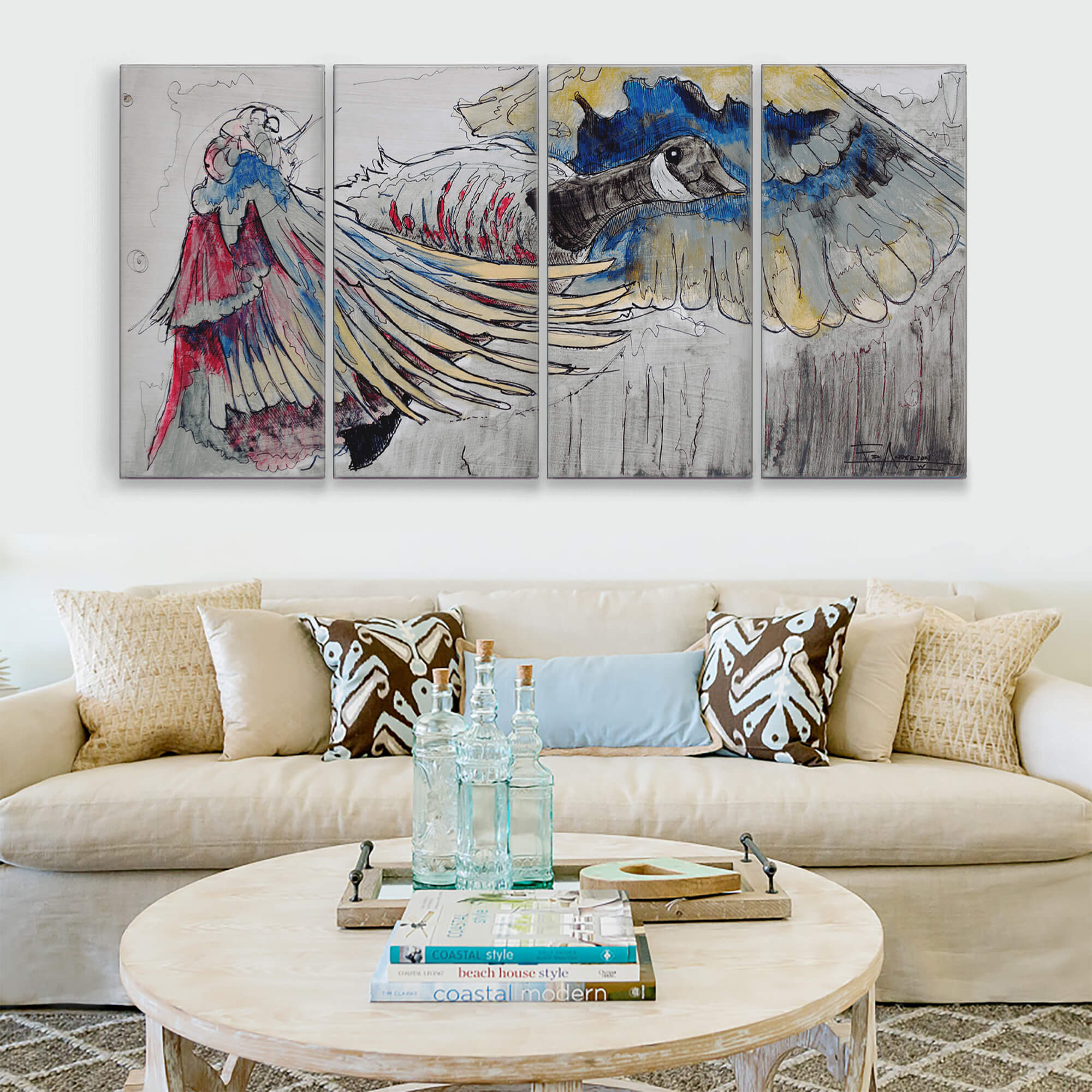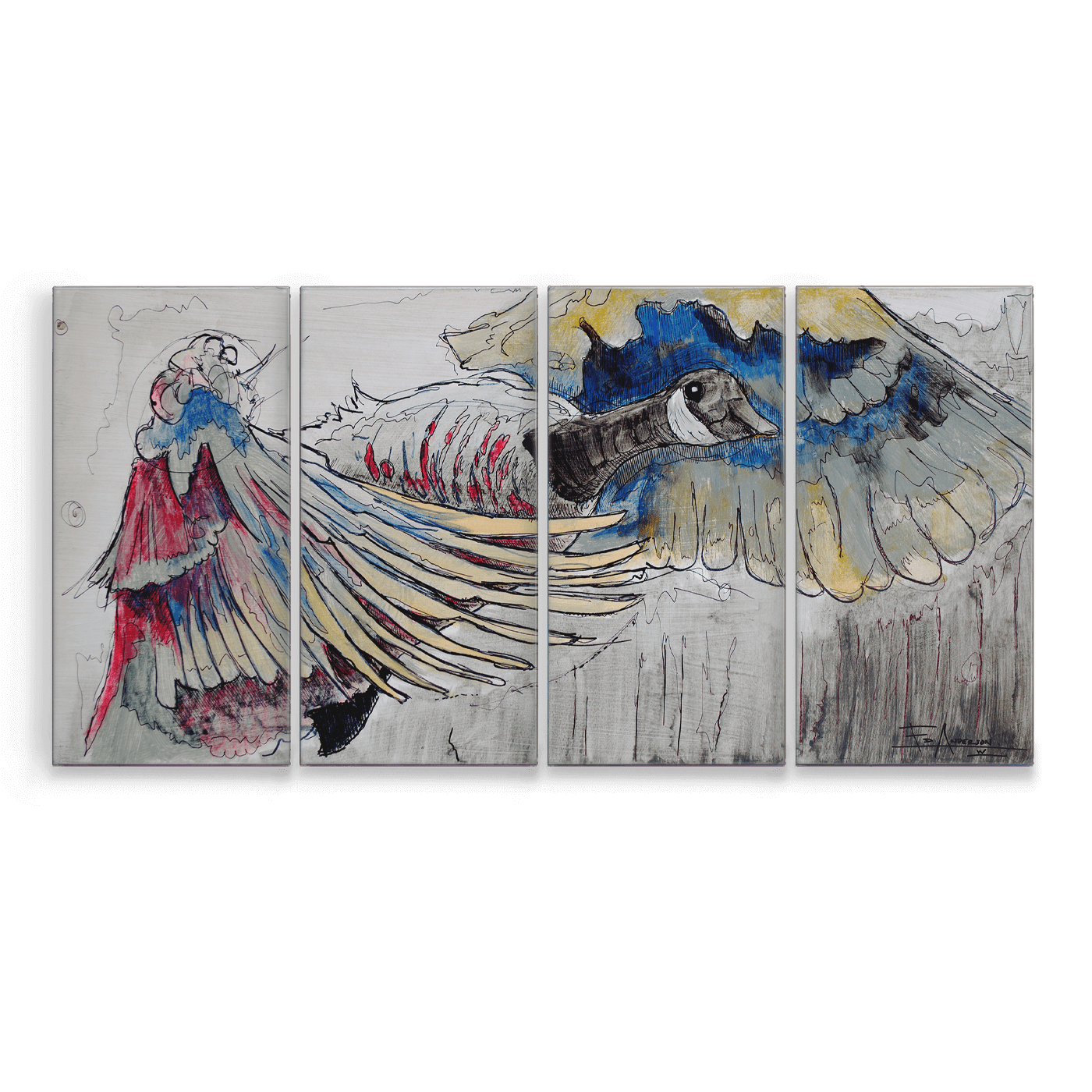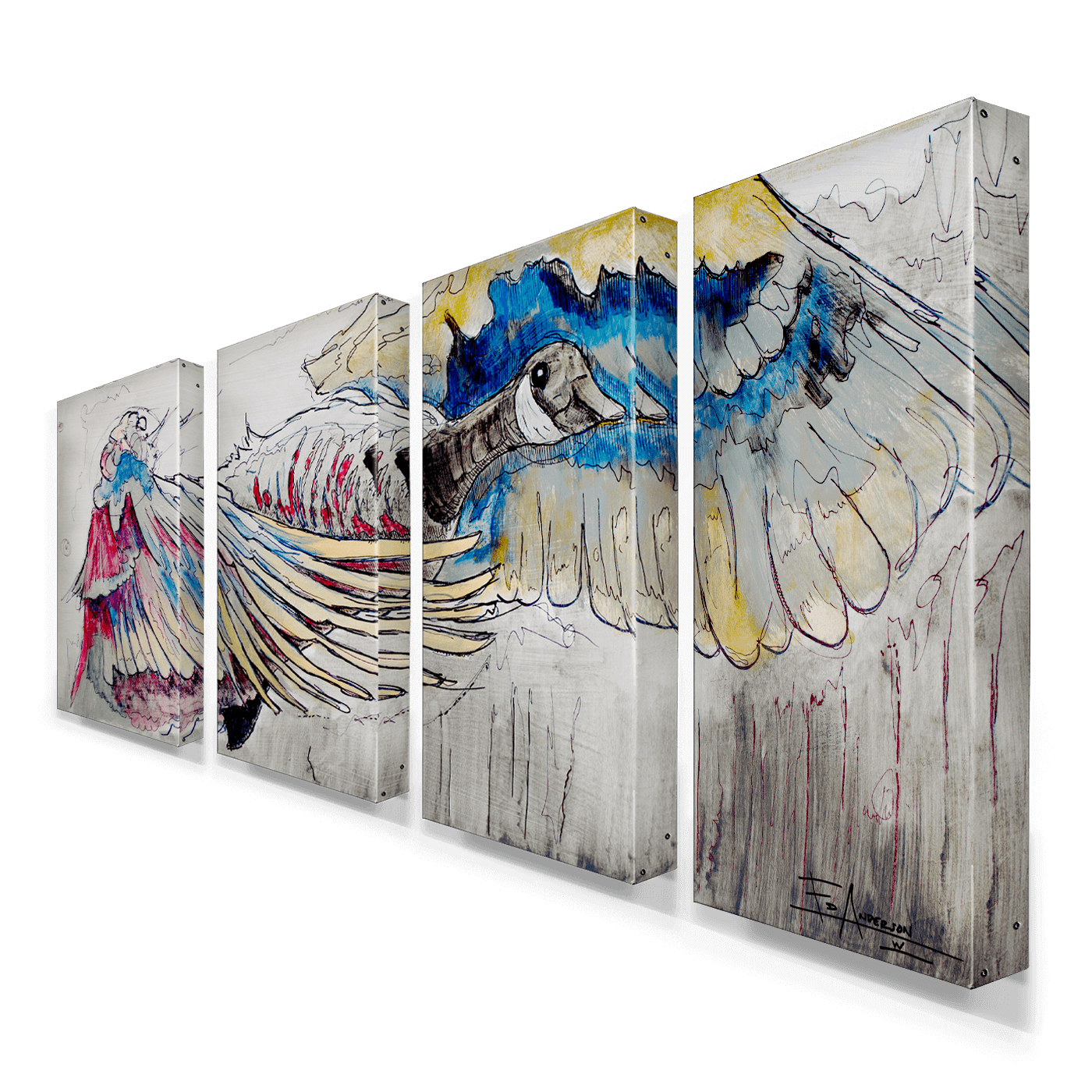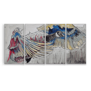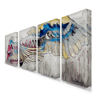 This striking artwork unfolds across four expansive panels, each measuring 21" x 42", culminating in an impressive 84" x 42" composition. The piece commands attention with its portrayal of a Canadian goose in flight, rendered with fluid lines and vibrant colors. The intricate detailing captures the bird's anatomy and its majestic wingspan, creating a sense of dynamic motion that brings the artwork to life. This large-scale piece invites the viewer to pause and take in the nuances of the composition, making it a striking focal point in any space.