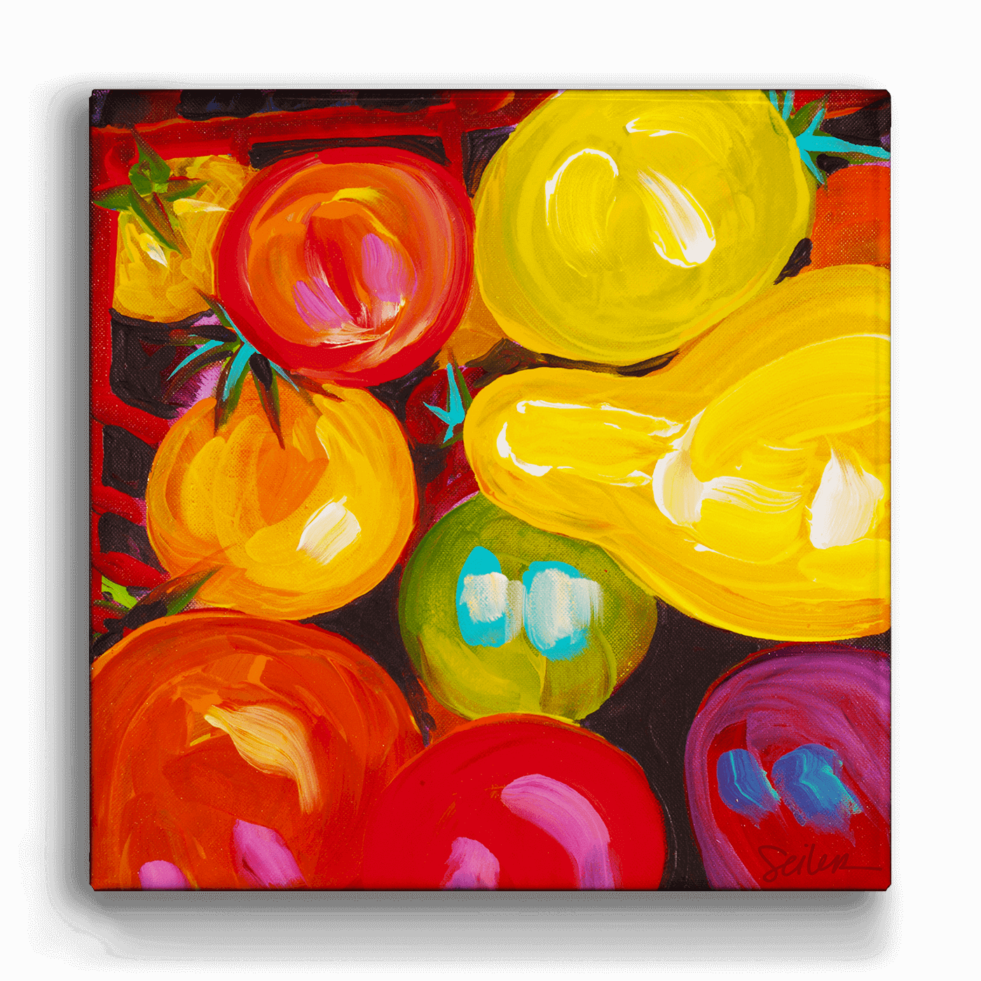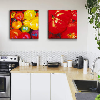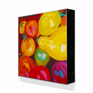 Dive into a world of color with this striking painting, where each brushstroke celebrates the dynamic beauty of freshly picked cherry tomatoes. The vivid reds, oranges, and yellows come alive against the deep backdrop, making this piece a perfect addition to any space that craves a splash of color and a hint of nature's vibrant bounty.