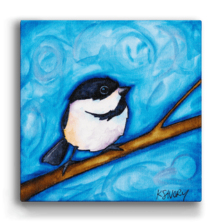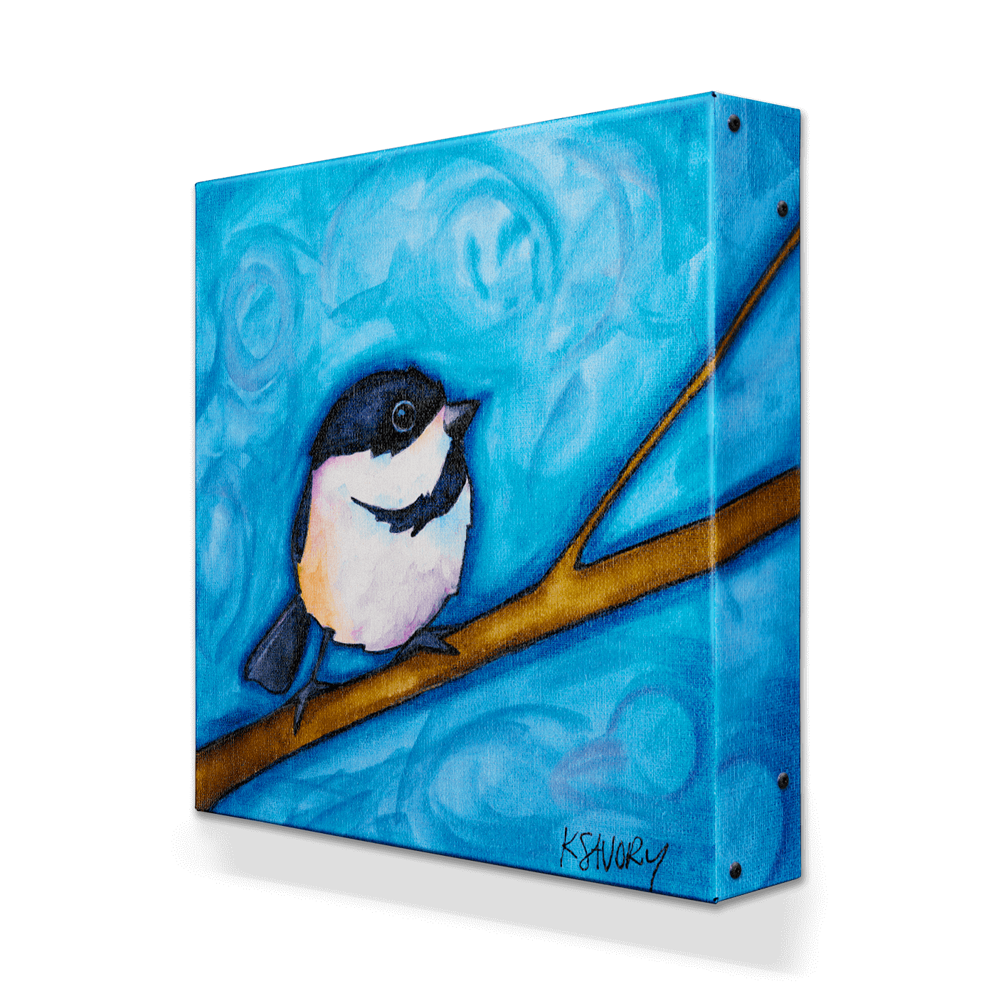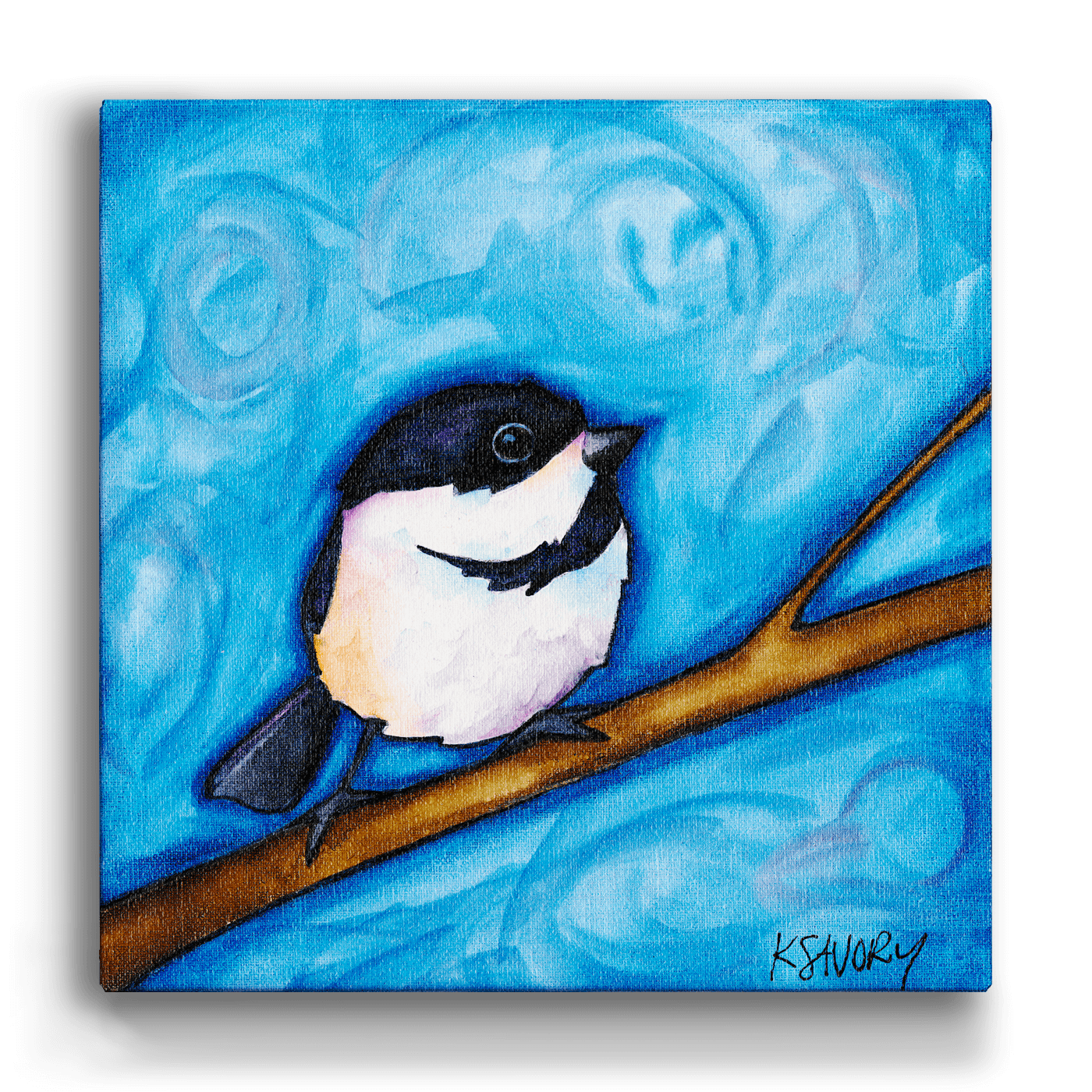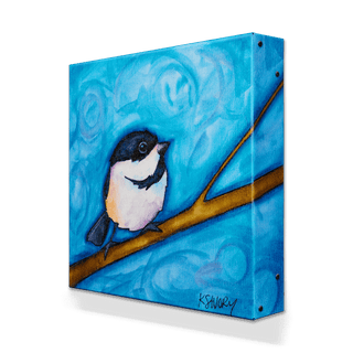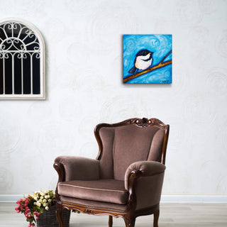 Celebrate the simple wonders of the outdoors with this delightful artwork featuring a cheerful chickadee perched on a slender branch. Surrounded by a swirling blue backdrop, this charming piece captures the playful energy and beauty of this beloved bird. Perfect for nature lovers or anyone looking to add a touch of whimsy to their decor, this artwork brings a calming yet joyful vibe to any room.