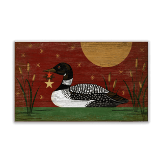 This rustic holiday artwork features a beautifully illustrated loon gracefully floating on a serene lake, holding a festive ornament in its beak. Set against a rich, warm red background with a golden moon and star accents, the piece evokes a peaceful, nature-inspired charm. The weathered wood texture adds a cozy, nostalgic feel, making it an ideal addition to holiday decor for nature lovers and those who appreciate wildlife art. Perfect for bringing a touch of woodland beauty and festive spirit into your home this Christmas season.