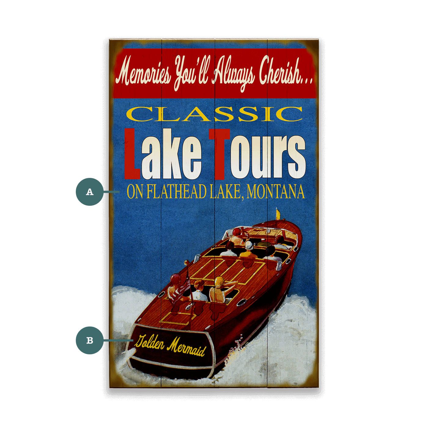 Experience the charm of classic lake tours with this vintage sign. Featuring a beautifully illustrated wooden boat cruising through the water, this artwork captures the joy and nostalgia of timeless lake adventures. The rich colors and retro design make it a perfect addition to any decor, adding a touch of history and elegance. Ideal for home, office, or business settings, this sign brings a sense of adventure and cherished memories to any space.