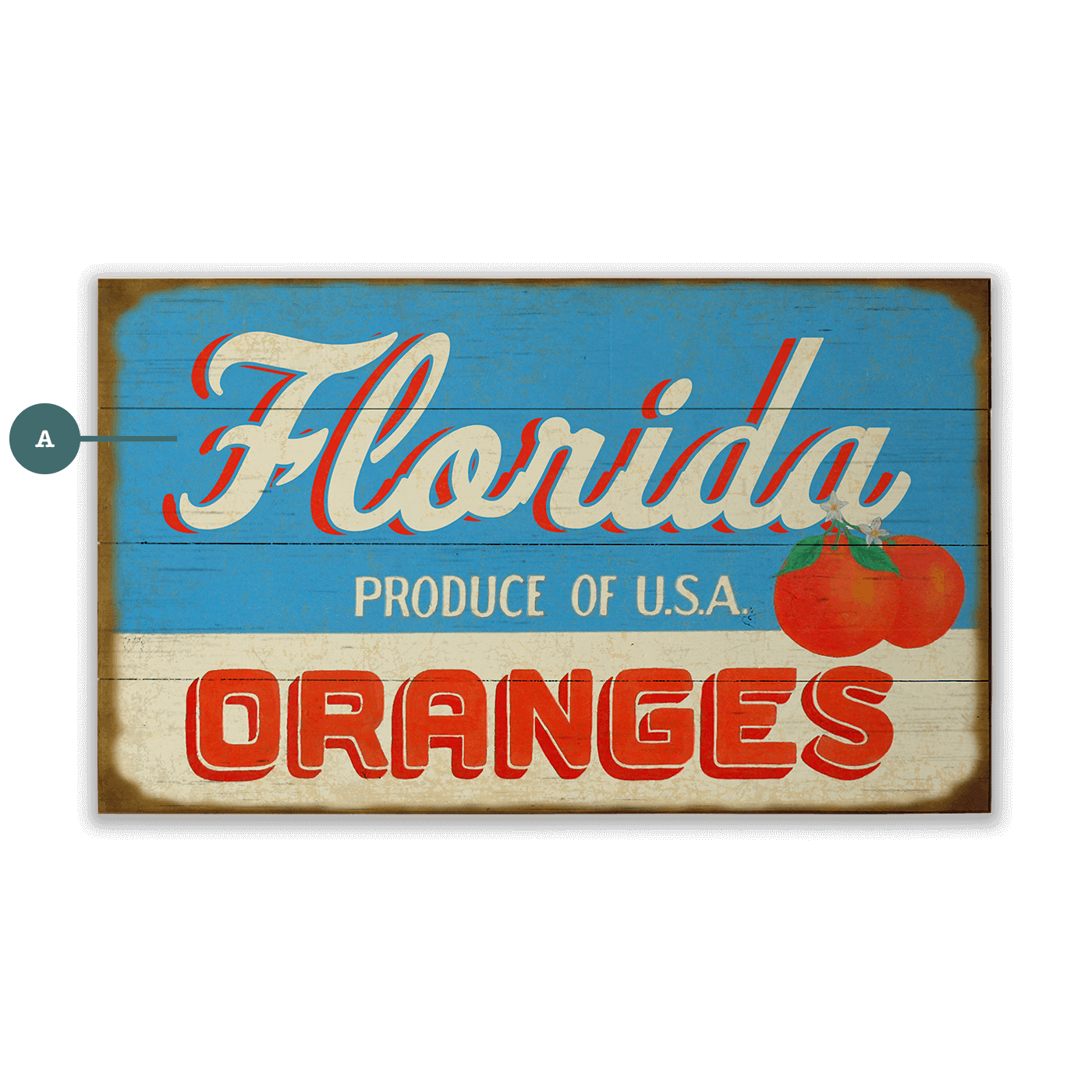 Experience the zest of the Sunshine State with our customizable vintage Florida Oranges sign! Ideal for kitchen decor, local produce markets, or as a sunny addition to any citrus lover's collection, this retro artwork celebrates Florida's iconic fruit. With a customizable section, you can tailor the sign to showcase your own city, family name, or business to create a unique, personalized piece. Featuring bold orage and blue lettering against a distressed background, this sign exudes classic Americana and is a vibrant nod to Florida's rich agricultural heritage.