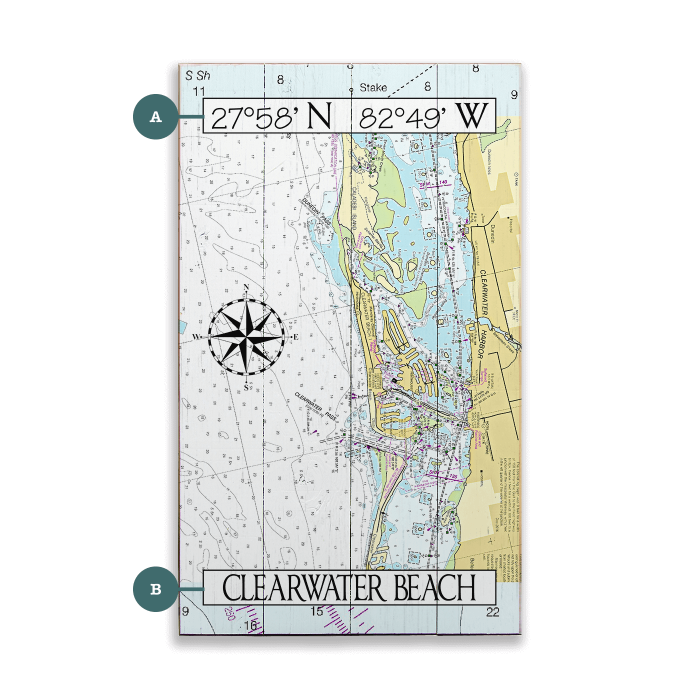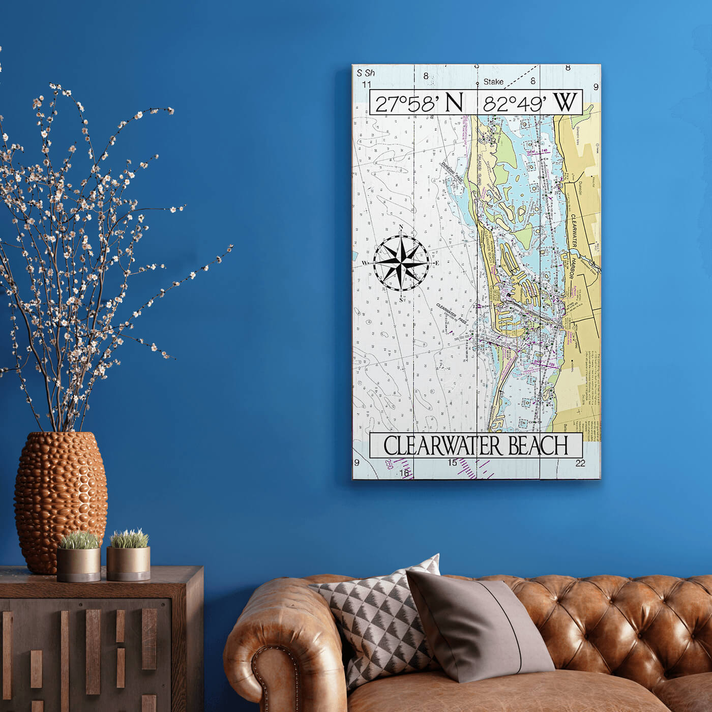 This artwork features a beautifully detailed chart of Clearwater Beach, Florida, showcasing the area's iconic coastal landscape with coordinates (27°58' N, 82°49' W) and a decorative compass rose. The name and coordinates can be customized, allowing you to personalize the piece to reflect your favorite beach destination. Perfect for adding a coastal touch to any space, this artwork captures the charm and beauty of Clearwater Beach in a unique and stylish way.