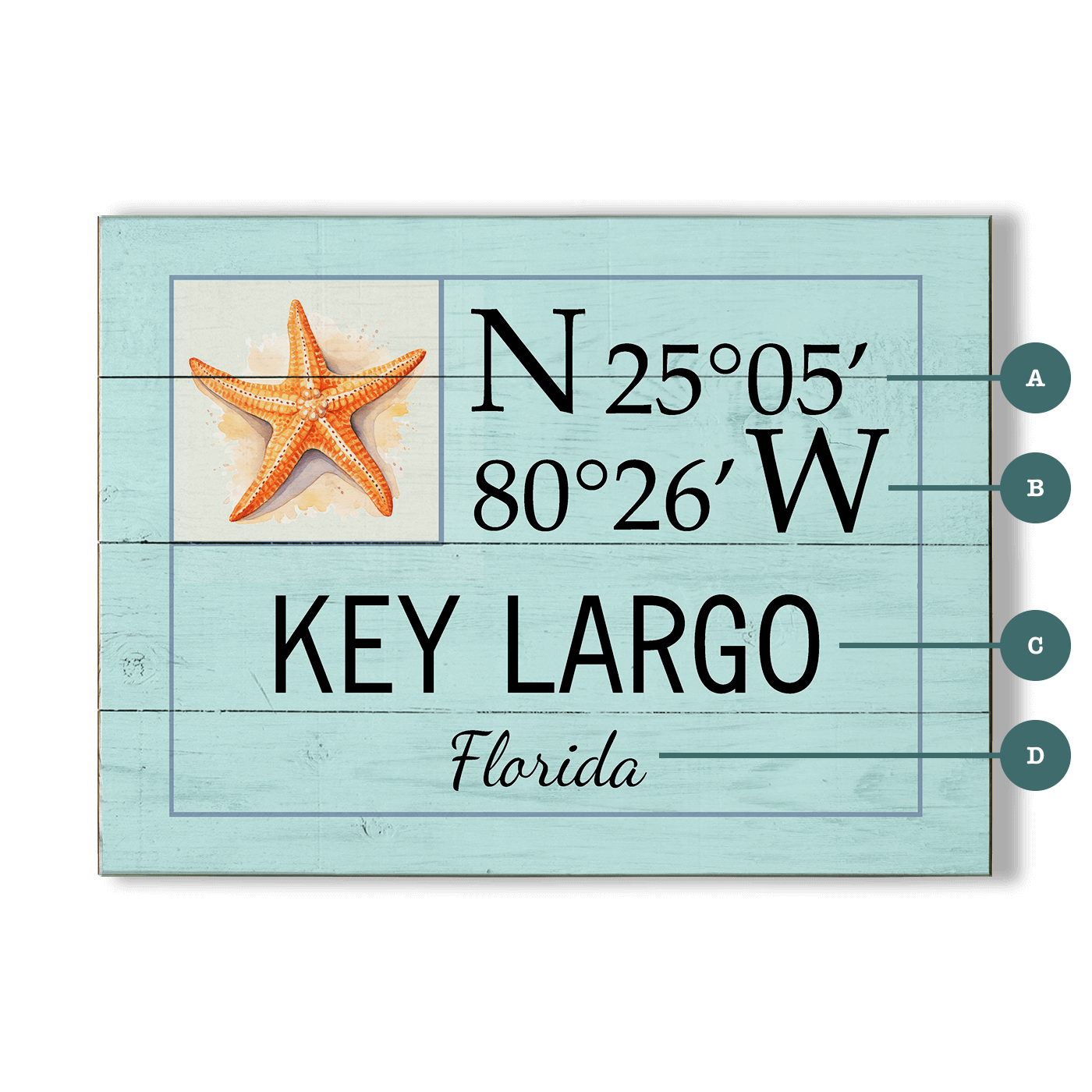 Bring coastal elegance to your space with this beautifully designed sign featuring a detailed starfish illustration, classic typography, and customizable coordinates. Ideal for beach houses, vacation rentals, or nautical-themed rooms, it offers a personal touch that celebrates your favorite coastal destination. The soothing, weathered background and natural colors evoke relaxed seaside living, making it a timeless accent for anyone who loves the shore.