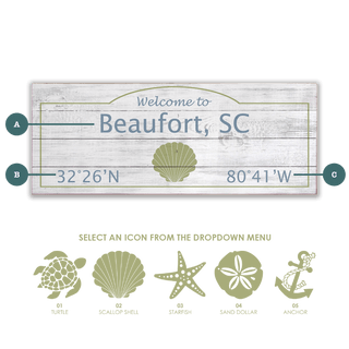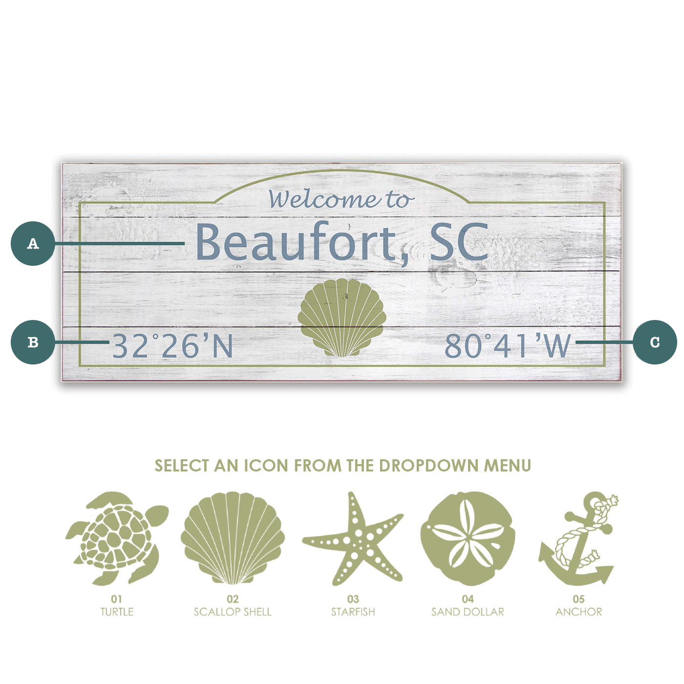 Celebrate the hospitality of coastal living with this charming sign featuring customizable location, coordinates, and your choice of five nautical-inspired icons. Its breezy, weathered finish and relaxed lettering evoke the laid-back spirit of beach towns and waterfront escapes. Ideal for homes, vacation rentals, or seaside businesses, it offers a personal touch that turns any space into a welcoming reminder of your favorite destination by the water.