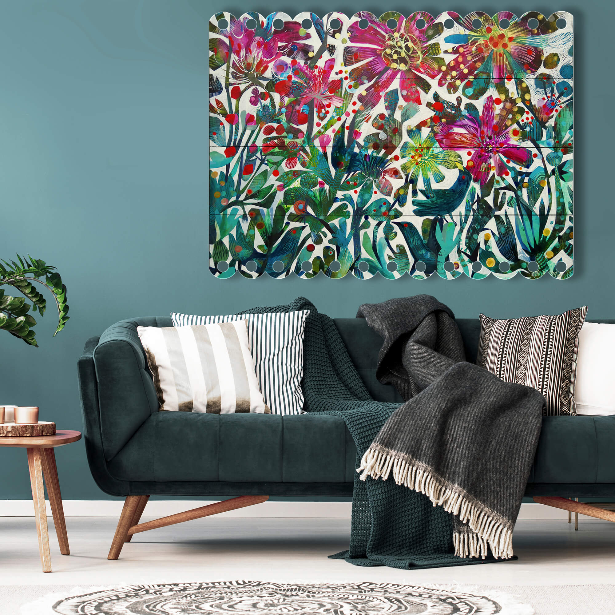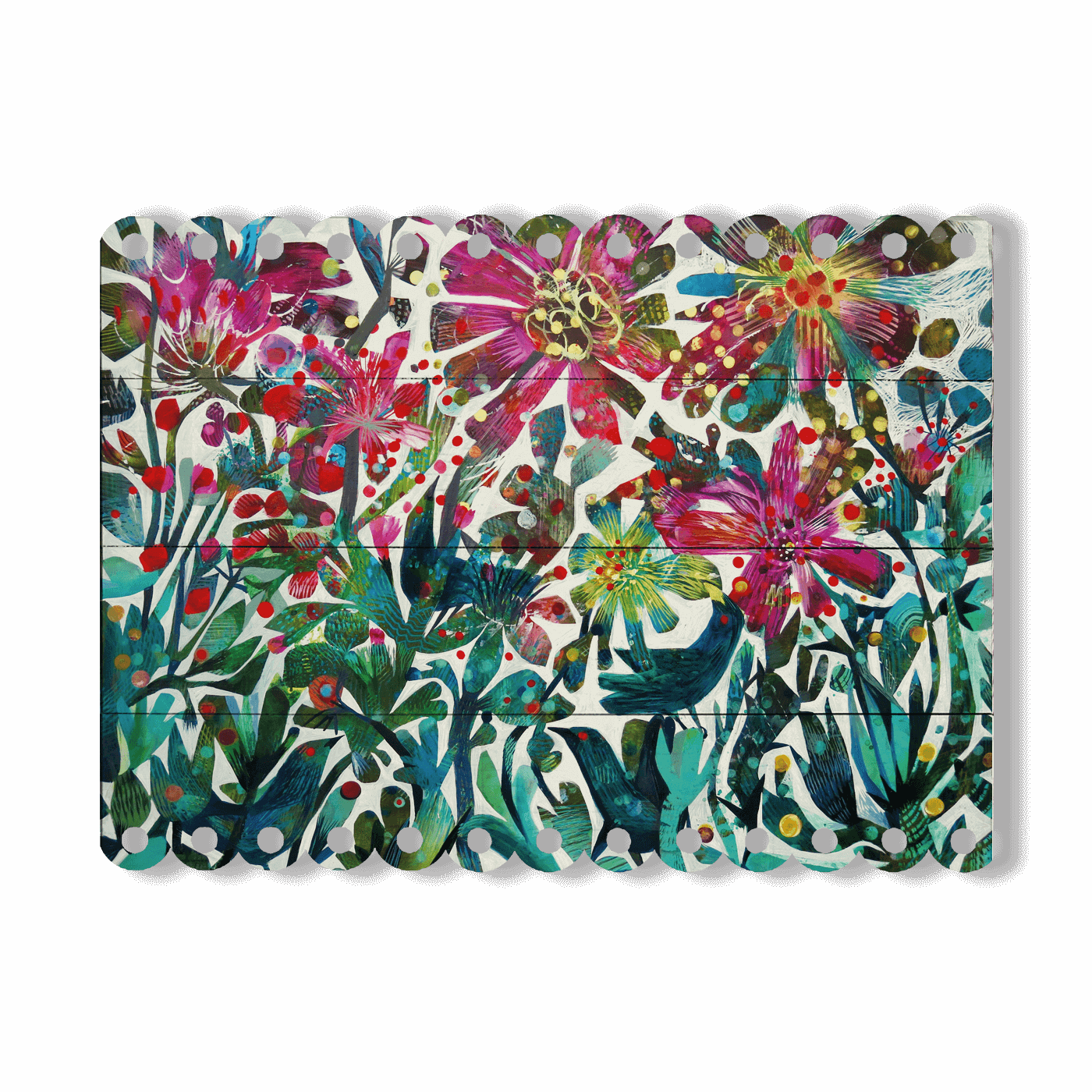 Rendered on a unique, statement-making, extra-large wooden canvas with charming scalloped edges, this piece blends Este's impressionistic touches with abstract flair.