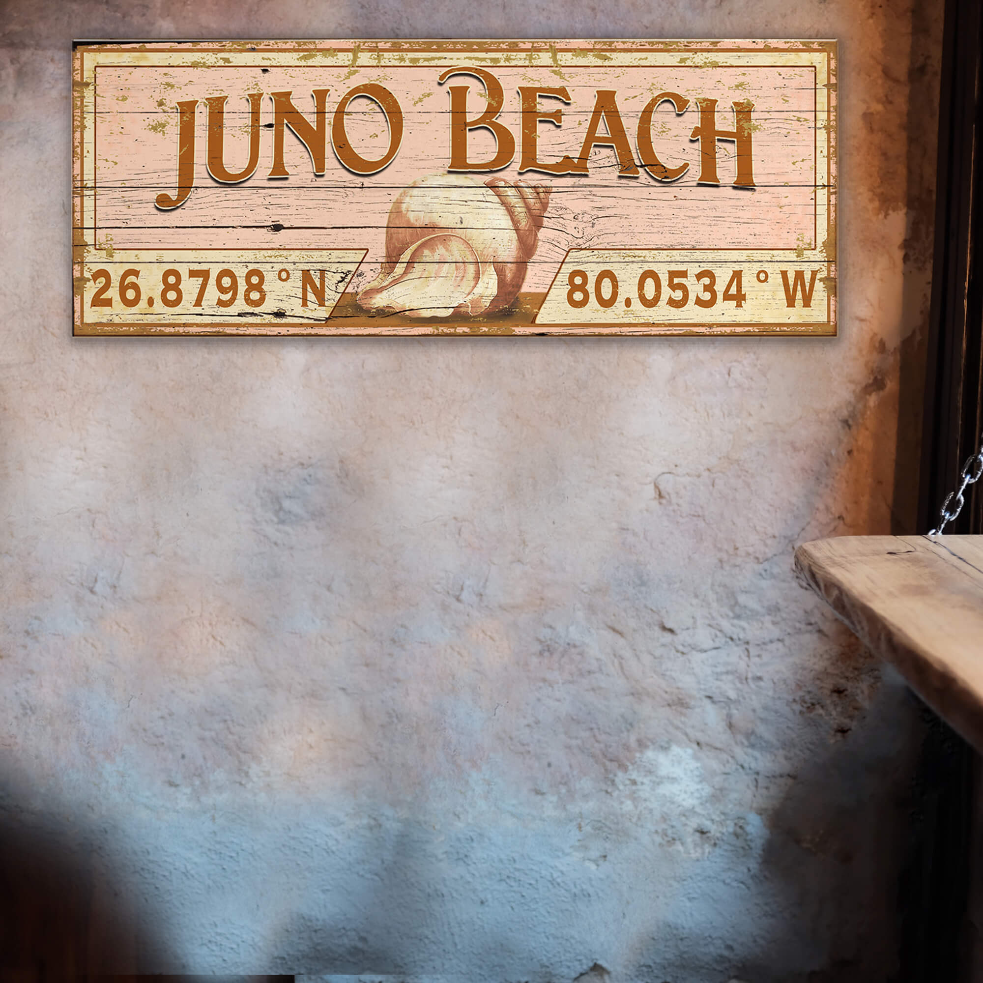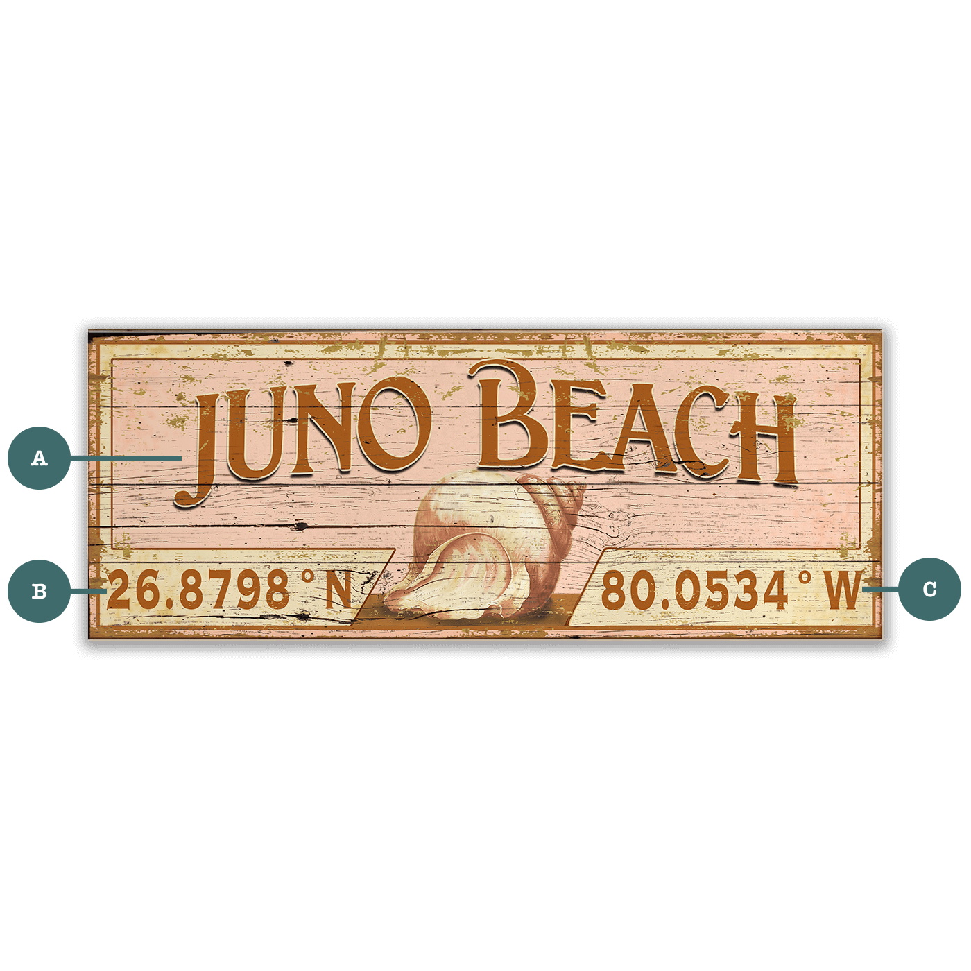 This coastal-inspired artwork features a vintage-style sign with a conch shell illustration and nautical coordinates, evoking the relaxed charm of a seaside retreat. The distressed wood finish and soft, earthy tones make it a great addition to beach-themed décor, coastal cottages, or nautical-inspired spaces. Personalization options are available, allowing you to add your own custom coordinates for a personal touch.