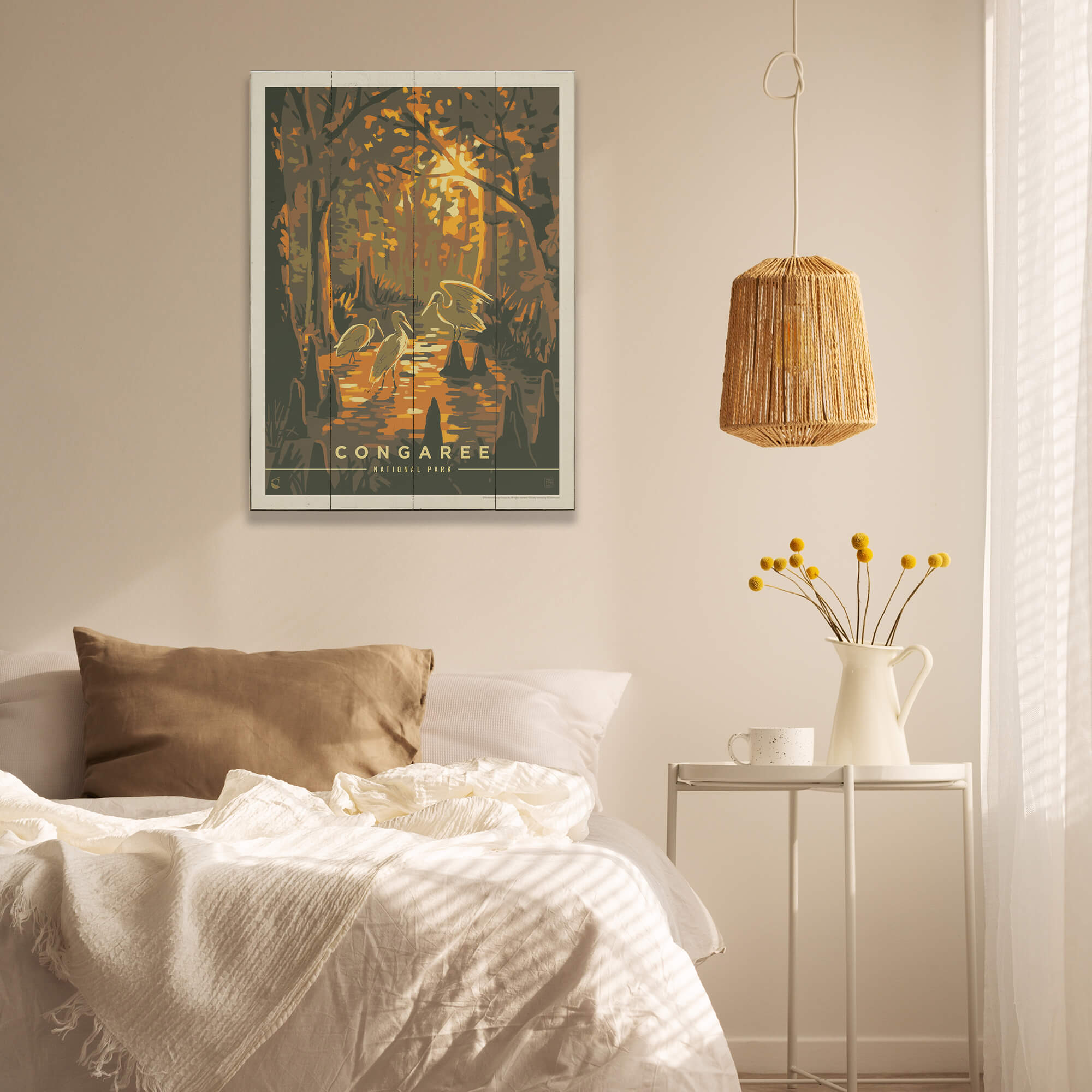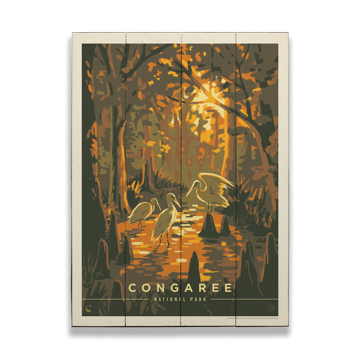 Immerse yourself in the golden glow of Congaree National Park with this evocative artwork featuring wading birds silhouetted in the warm light of a rising sun. Towering trees and shallow waters frame a scene teeming with quiet life, reflecting the park’s role as a sanctuary for both wildlife and solitude. Known for its rich floodplain forest and extraordinary biodiversity, Congaree is a rare remnant of the ancient landscapes that once blanketed the Southeast. This piece captures the park’s timeless rhythm and the peaceful beauty found in every still reflection.