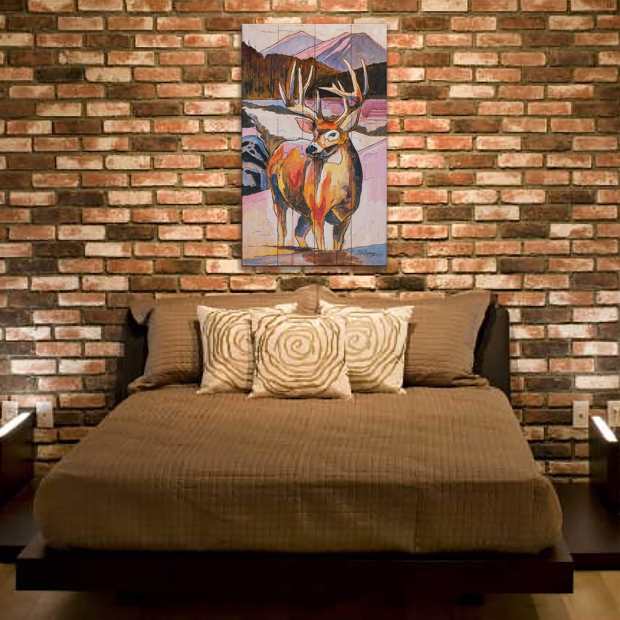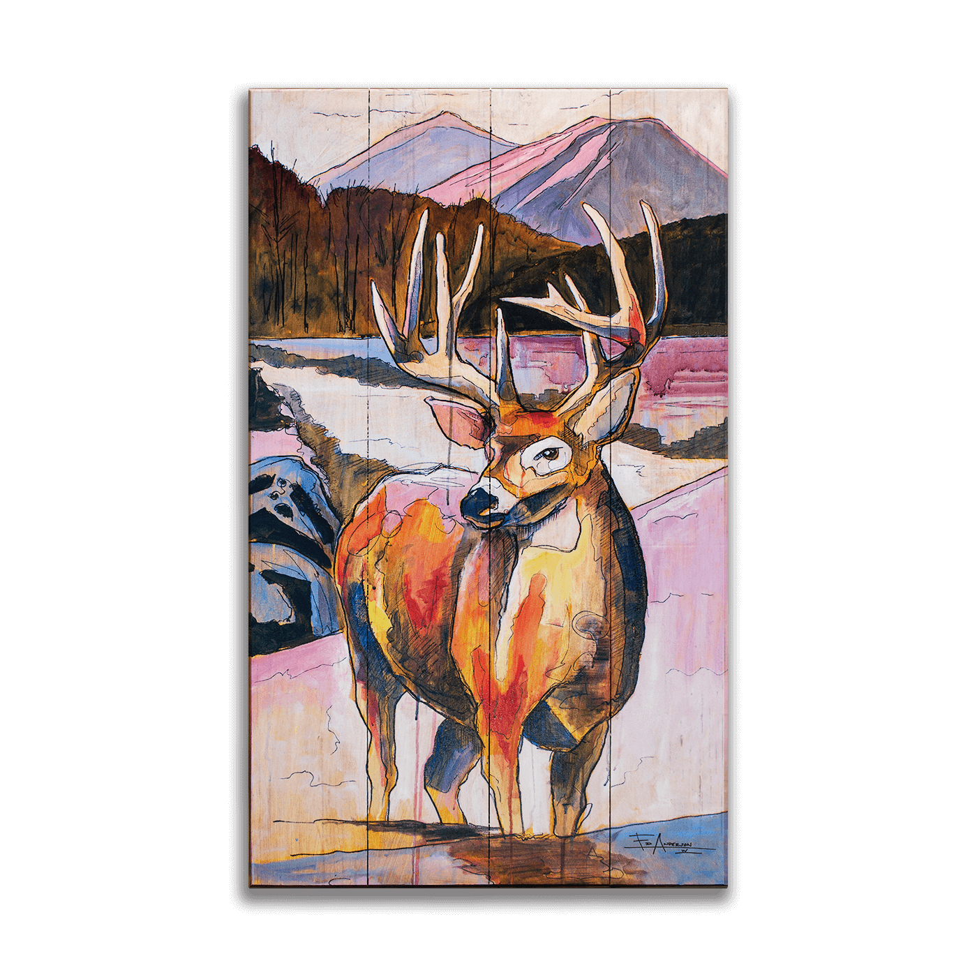 This evocative artwork brings to life the majestic presence of a buck, set against a serene natural backdrop. The buck's impressive antlers and alert stance highlight its majestic beauty, embodying the spirit of the forest. The painting's vibrant colors and intricate details capture the essence of this noble animal, making it a perfect piece for wildlife enthusiasts or those who appreciate the splendor of the wilderness.