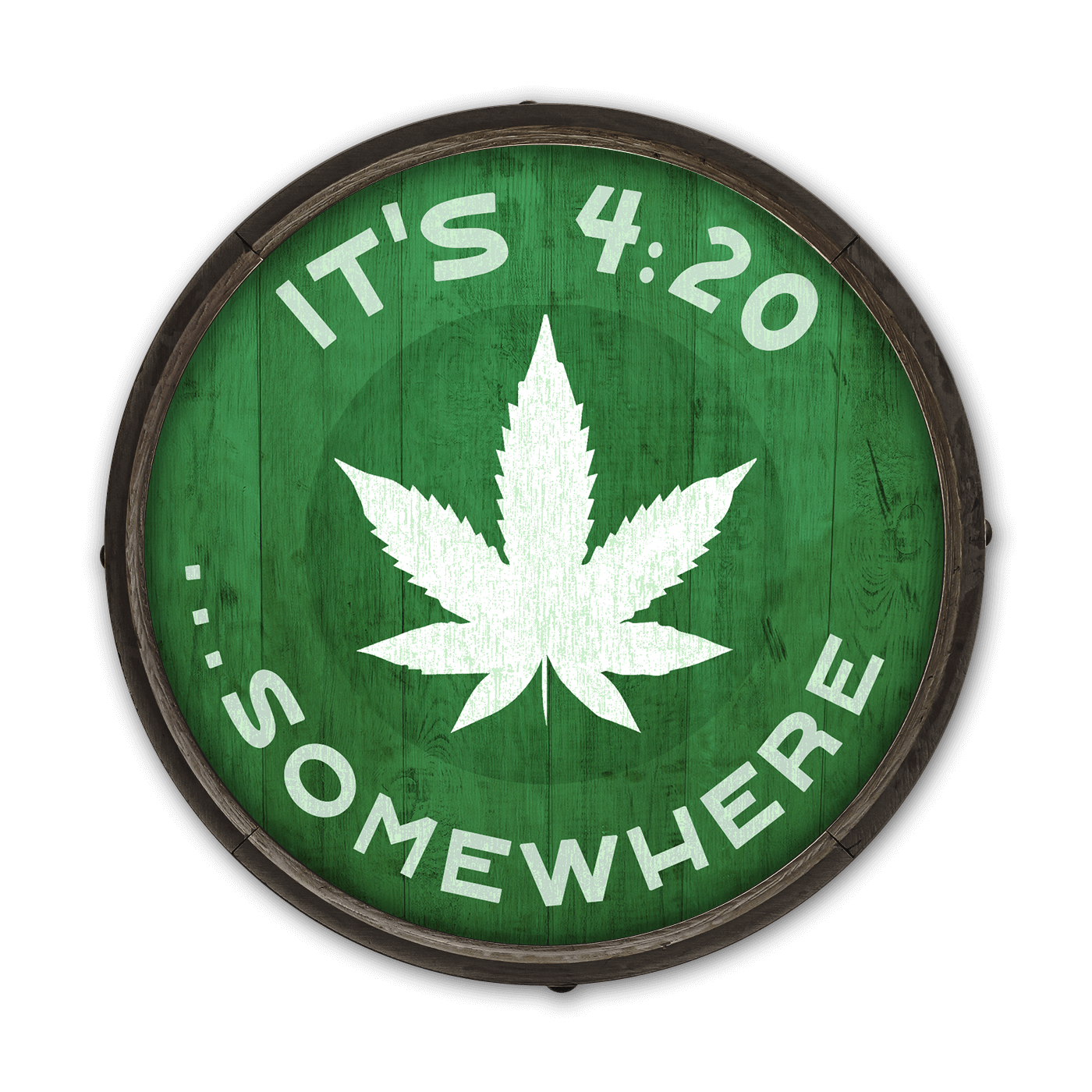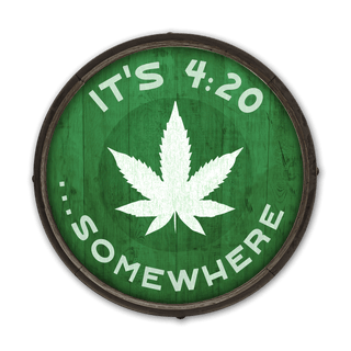 Discover the perfect blend of rustic charm and contemporary flair with this unique barrel-end artwork. It features a vibrant cannabis leaf at the center, surrounded by the playful phrase - It's 4:20 somewhere - in bold, eye-catching fonts. This artwork presents a classic, weathered background, giving it a vintage feel that's ideal for any space that embraces a shabby chic or farmhouse aesthetic.