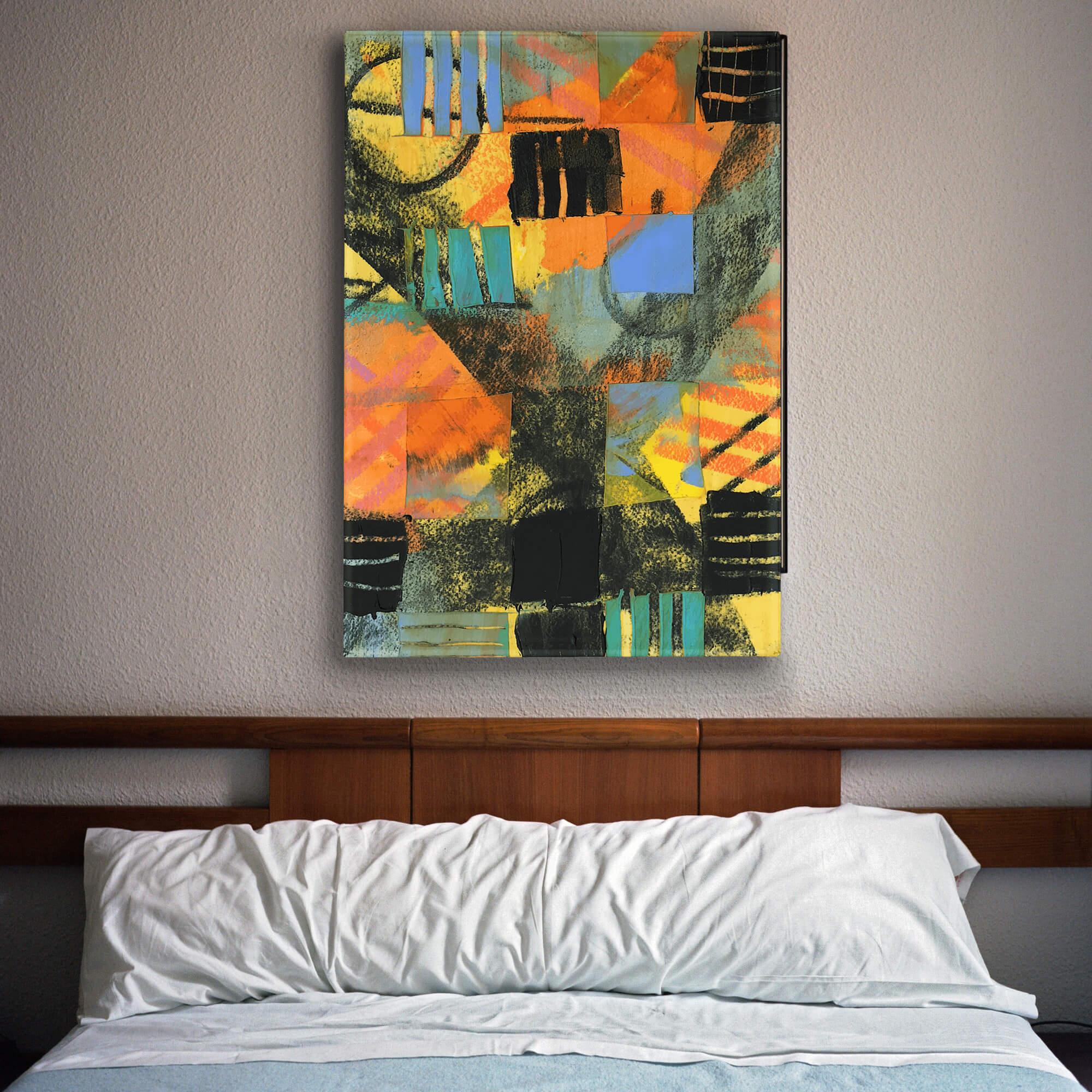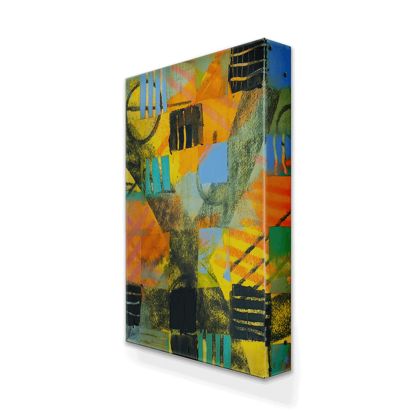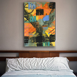 Introducing 'Orange Chex,' an abstract artwork that bursts with the energy of geometric shapes and a vivid color palette. This piece captures the eye with an arresting mix of orange hues, balanced with touches of blues and yellows, and grounded by bold blacks. The interplay of color and form creates a visual rhythm that mimics the complexity of a checkerboard with an artistic twist. Each square in the array adds to a larger, cohesive narrative, making 'Orange Chex' a perfect statement piece for any modern interior seeking a splash of color and an edge of contemporary sophistication.