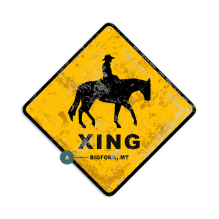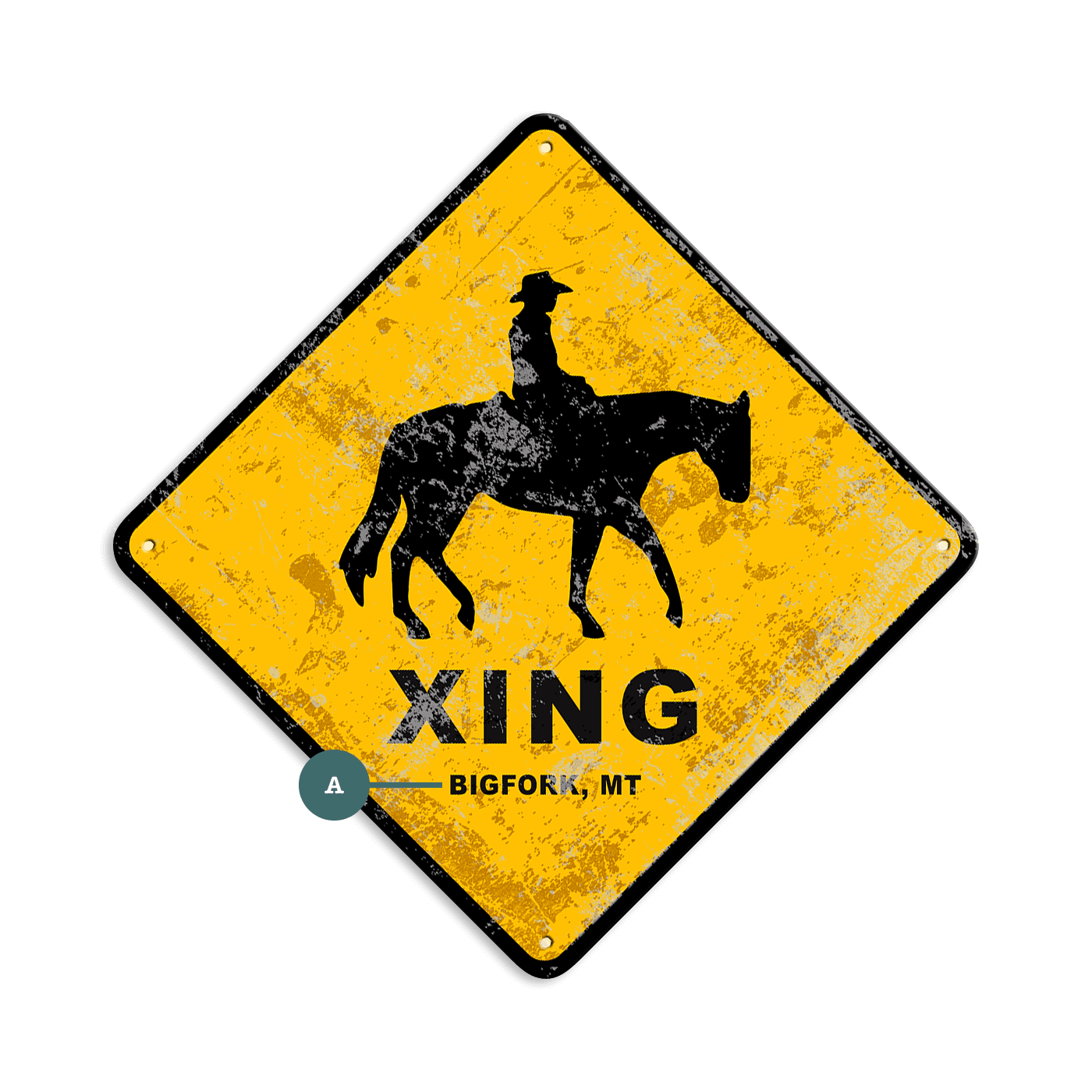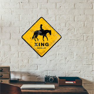 This rustic, vintage-style artwork puts a Western twist on a classic road sign, featuring a bold silhouette of a horseback rider against a weathered yellow background. The distressed texture adds an authentic, timeworn feel, evoking the rugged charm of open trails and frontier landscapes. With its striking simplicity and nostalgic appeal, this piece is perfect for equestrian lovers, ranch enthusiasts, and those who embrace the slow-paced rhythm of country life. Whether displayed in a barn, cabin, or Western-themed space, it serves as a timeless reminder that the spirit of the West still rides strong.