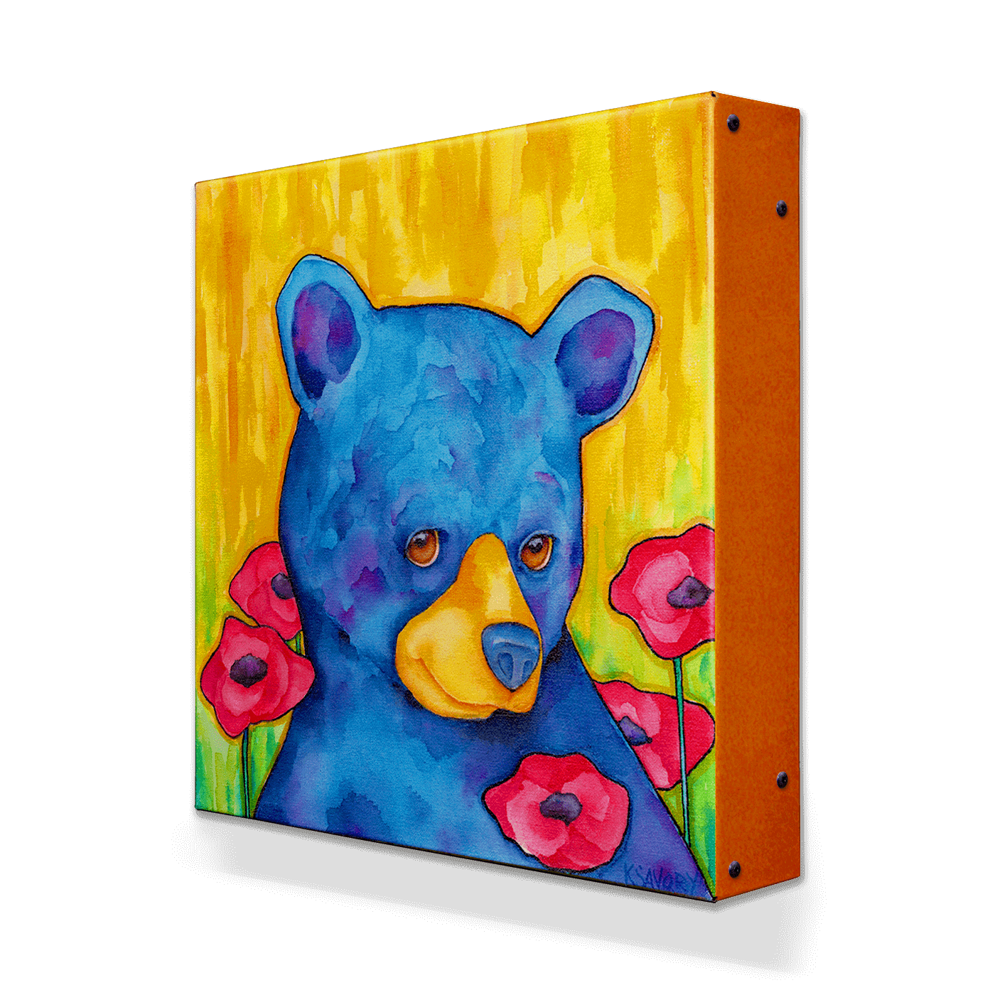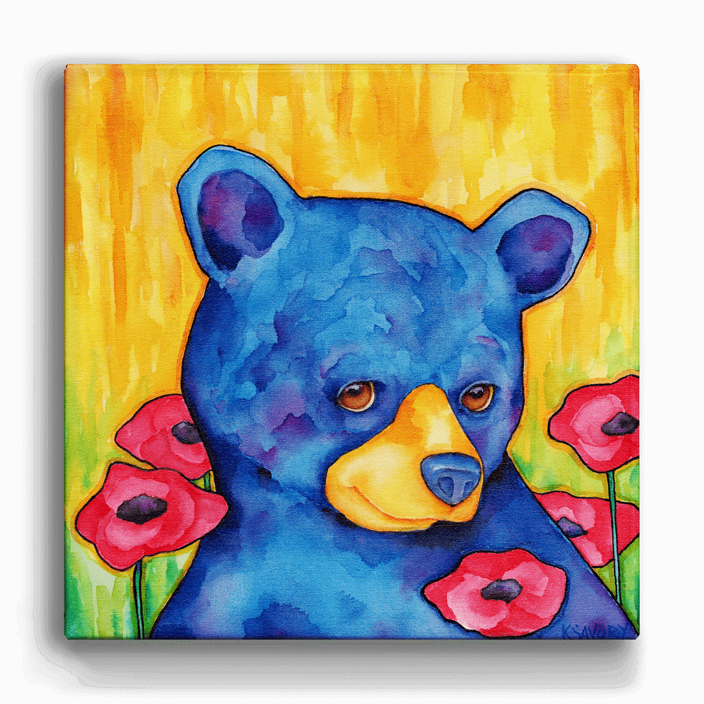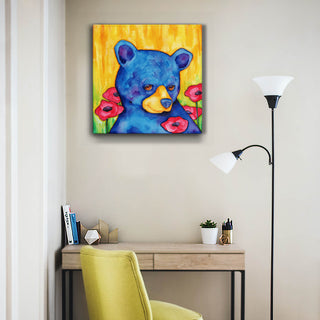 "Coy Belle" is a captivating piece of art that features a beautifully rendered blue bear peeking through vibrant red poppies against a radiant yellow background. The unique blend of colors and the bear's shy, engaging gaze infuse this painting with a warm and inviting atmosphere, making it a standout addition to any art collection. Perfect for adding a touch of whimsy and charm to any room, this artwork combines the tranquility of nature with a playful artistic style, ensuring it captures the attention and hearts of all who view it.