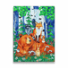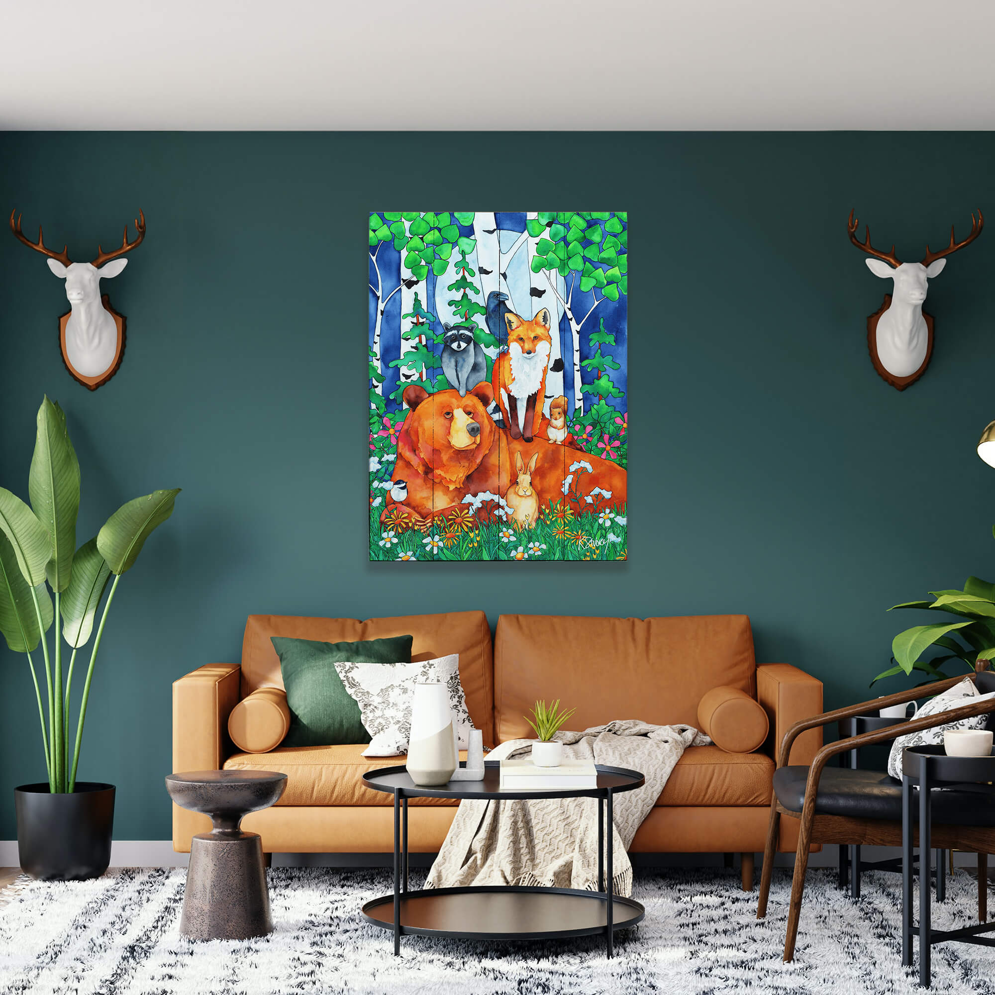 Delve into a vibrant woodland gathering with this captivating watercolor painting, featuring an ensemble of forest animals including a bear, fox, raccoon, raven, and rabbit, and squirrle amidst a lush, colorful backdrop. The lively scene is set against a canvas of bright birch trees and verdant foliage, punctuated by colorful wildflowers, creating a tapestry of nature's beauty and diversity. It's perfect for adding a lively splash of nature to any room and is sure to enchant animal lovers and art collectors alike with its cheerful and inviting composition.