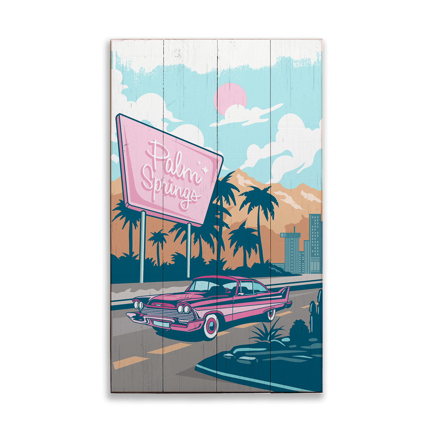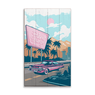 This retro-inspired artwork showcases a classic drive through a mid-century desert cityscape, aka Palm Springs, complete with palm trees, neon signage, and a vintage car cruising the sunny boulevard. The vibrant color palette and nostalgic design make it a perfect addition to spaces that embrace a retro vibe or a love for iconic road trips. Ideal for living rooms, offices, or any space seeking a touch of vintage flair.