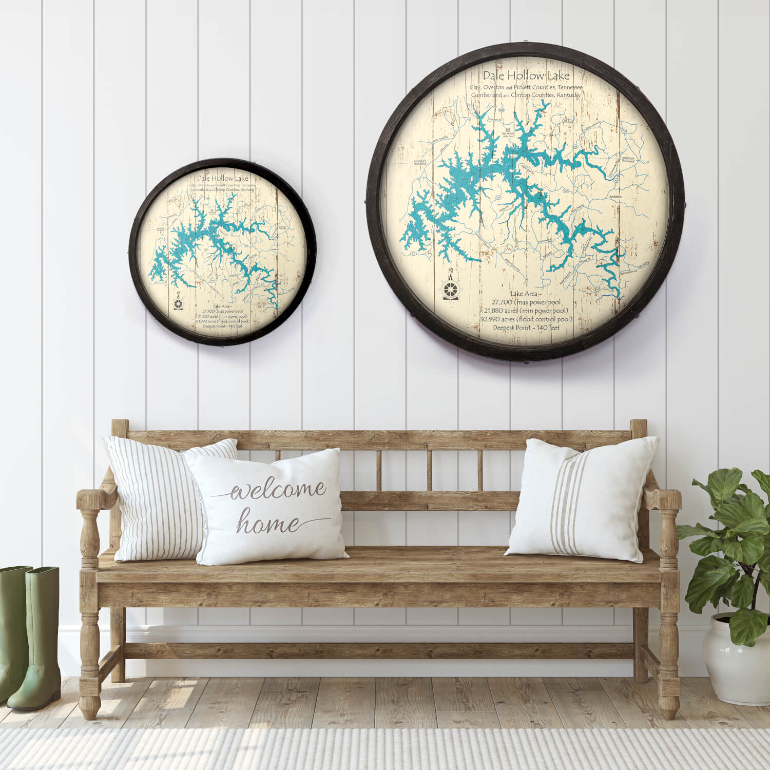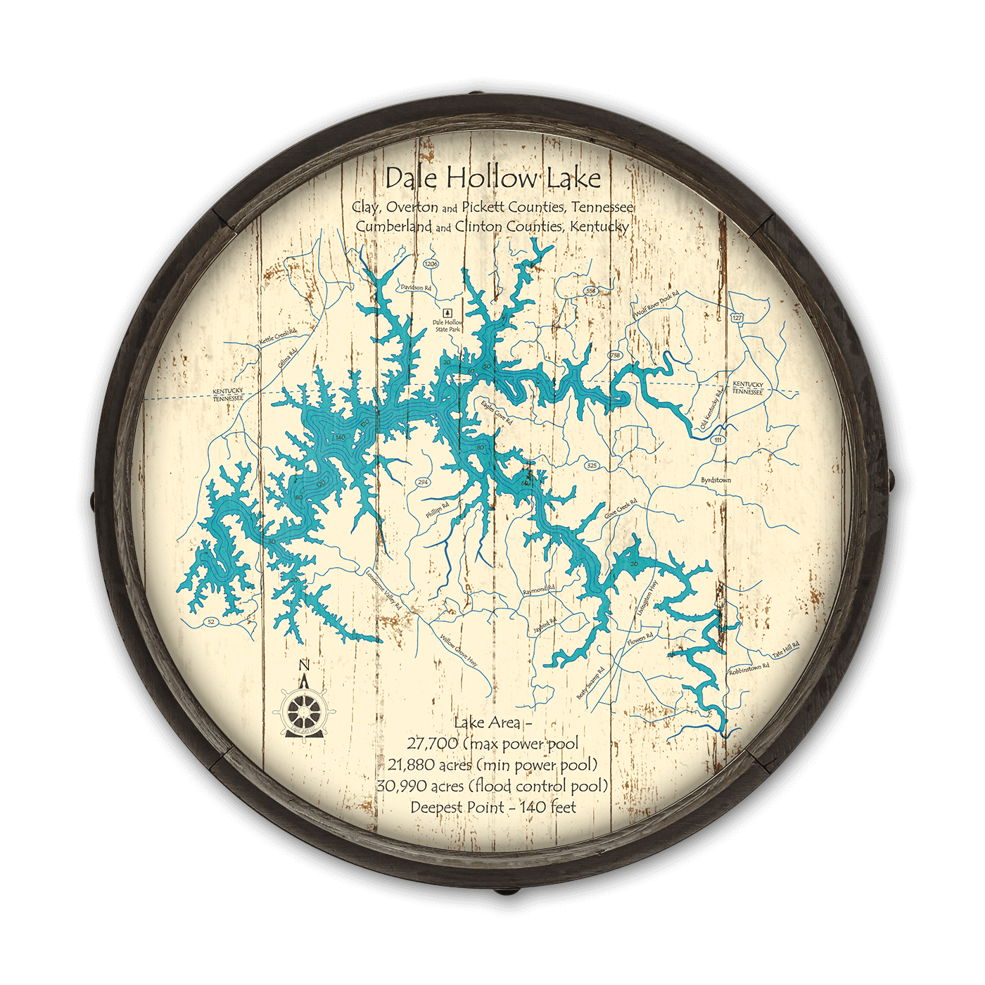 Discover the natural beauty of Dale Hollow Lake, a sprawling reservoir that spans the Tennessee-Kentucky border, winding through Clay, Overton, and Pickett Counties in Tennessee, and Cumberland and Clinton Counties in Kentucky. This detailed map showcases the lake’s intricate shoreline and deep blue waters, celebrated for world-class fishing, houseboating, and serene wilderness escapes. Surrounded by rolling hills and forested shores, Dale Hollow offers a peaceful retreat for outdoor lovers, with opportunities for kayaking, hiking, and wildlife watching. Whether you’ve spent summers on the water or simply admire its scenic charm, this artwork is a lasting tribute to one of the South’s most treasured lakes.