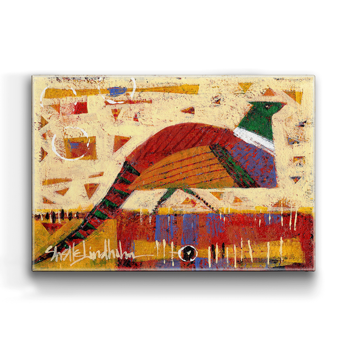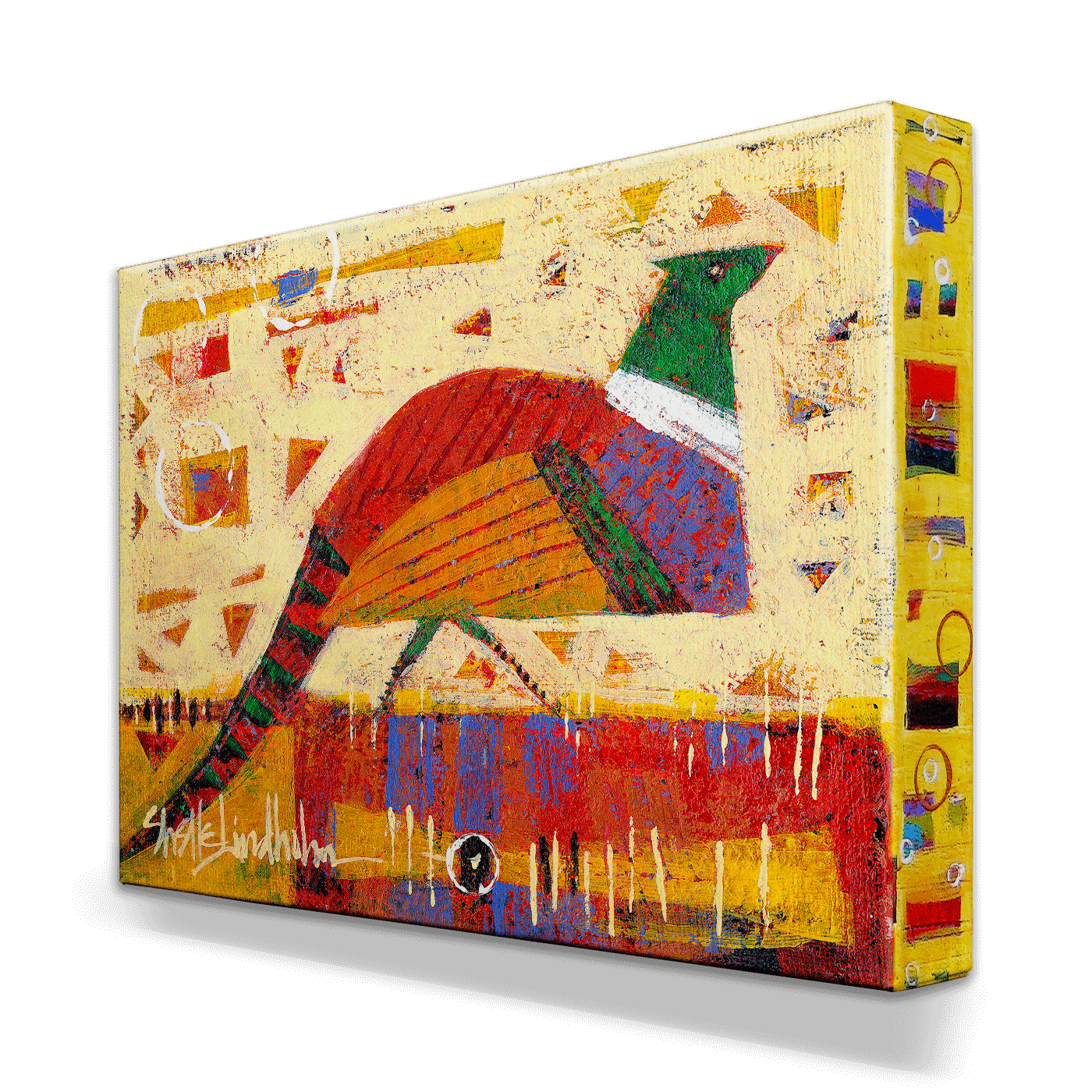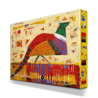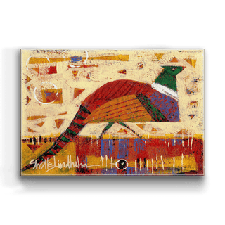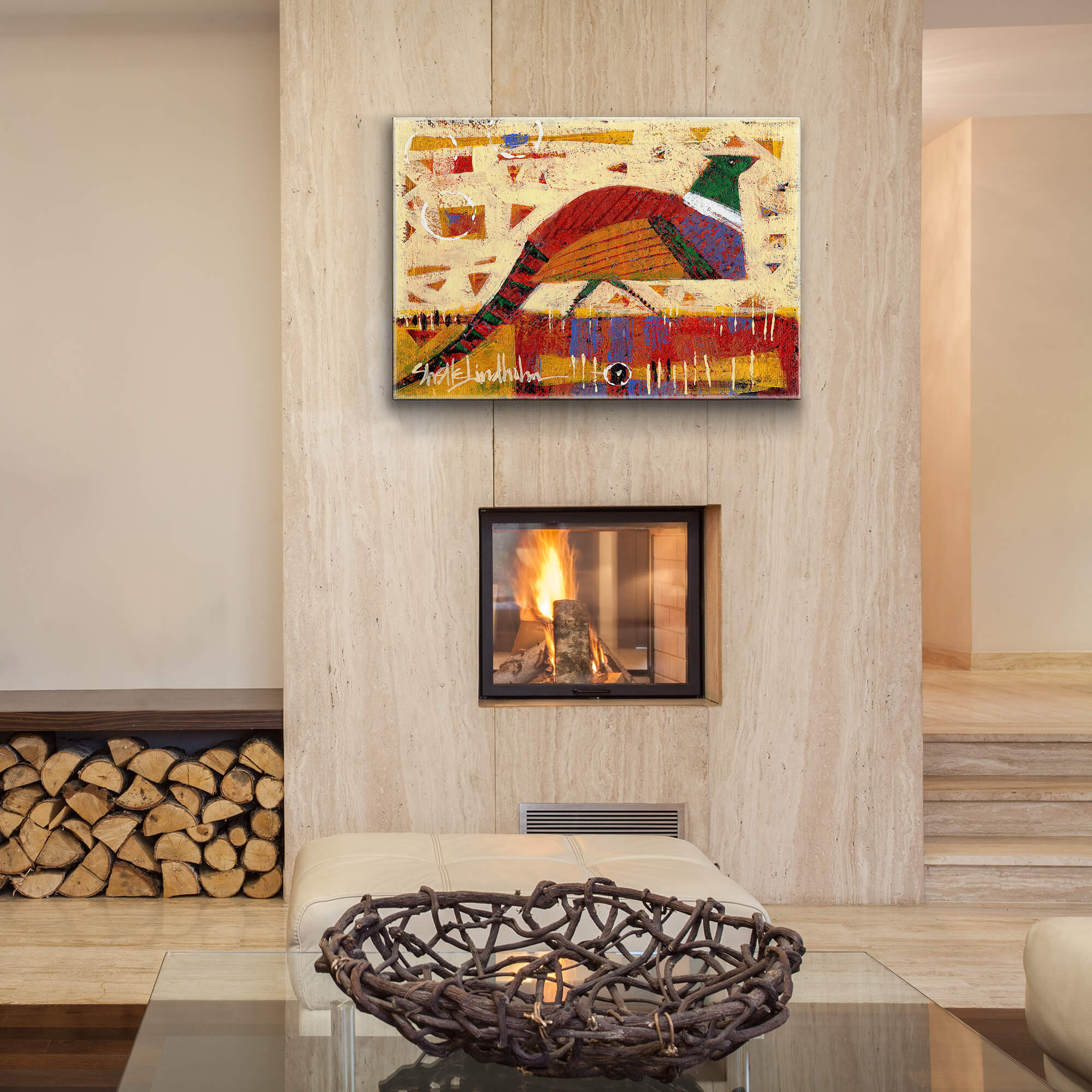Bring a vibrant touch of nature to your space with this striking artwork featuring a colorful pheasant against a textured beige backdrop. The bold geometric patterns and rich hues of red, green, and gold create a dynamic and contemporary composition. Perfect for adding warmth and personality, this piece is a great choice for art lovers and nature enthusiasts alike.