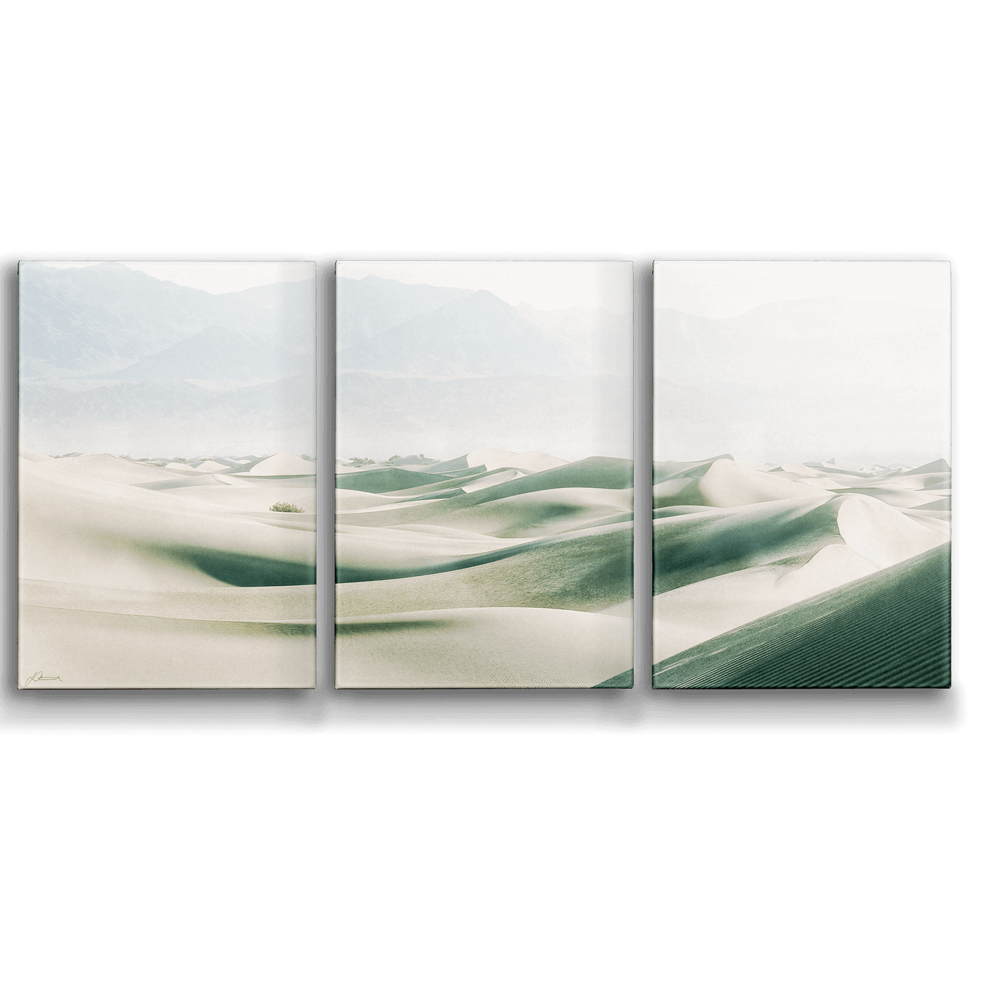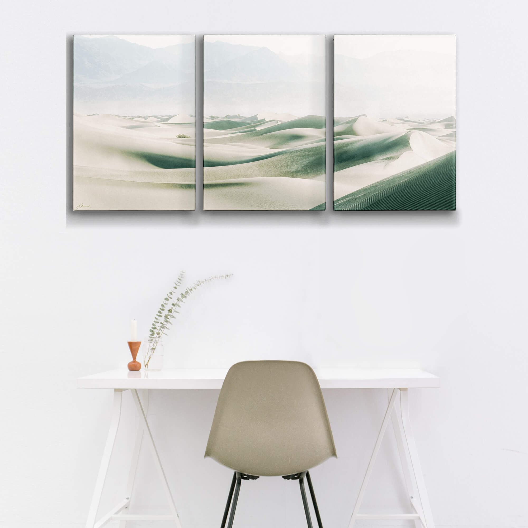 Embrace the stark, mesmerizing beauty of Death Valley with this exquisite triptych wall art. Featuring the sweeping sand dunes of one of the most foreboding environments on earth, this artwork captures the quiet majesty and undulating contours of the desert landscape. The soft, shifting sands and distant mountain silhouettes play with light and shadow, creating a serene yet dramatic view that evokes the timeless allure of this rugged natural wonder.