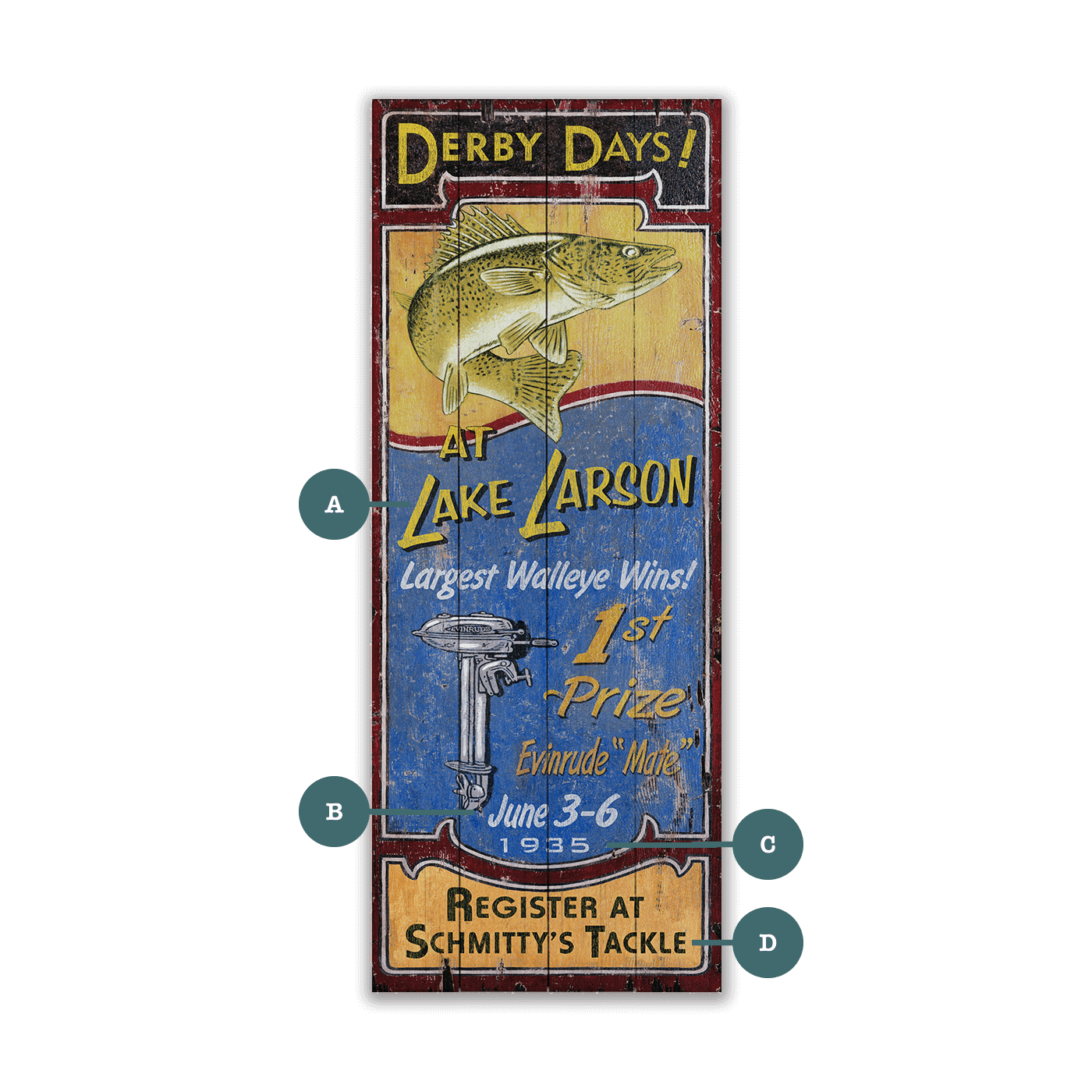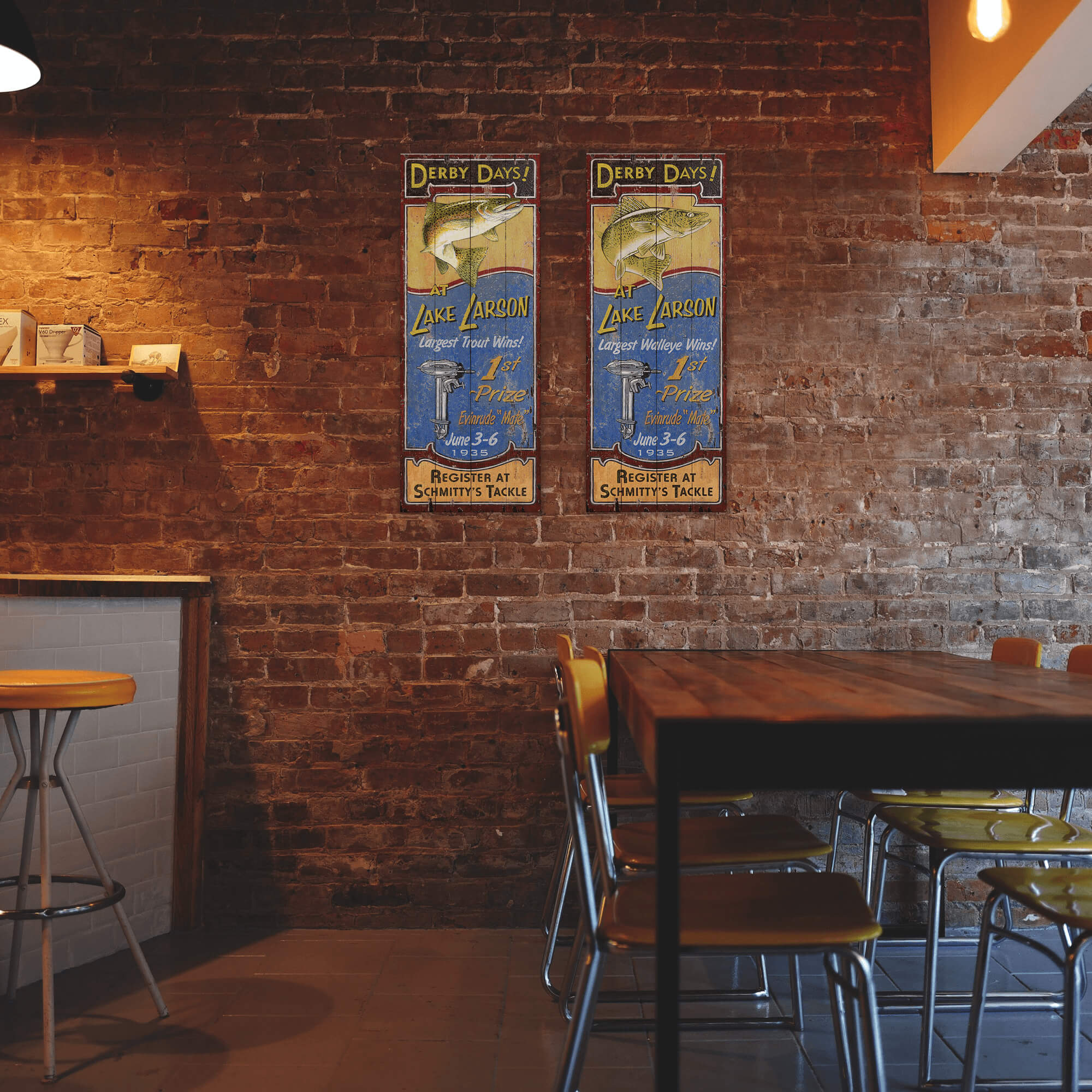 This vintage-style artwork highlights a lively fishing derby, featuring a bold illustration of a large walleye and a classic outboard motor as the grand prize. The design brings a nostalgic feel of friendly competition and outdoor fun, making it perfect for decorating a cabin, lodge, or any fishing-themed room. Its retro charm adds an adventurous touch to rustic decor.