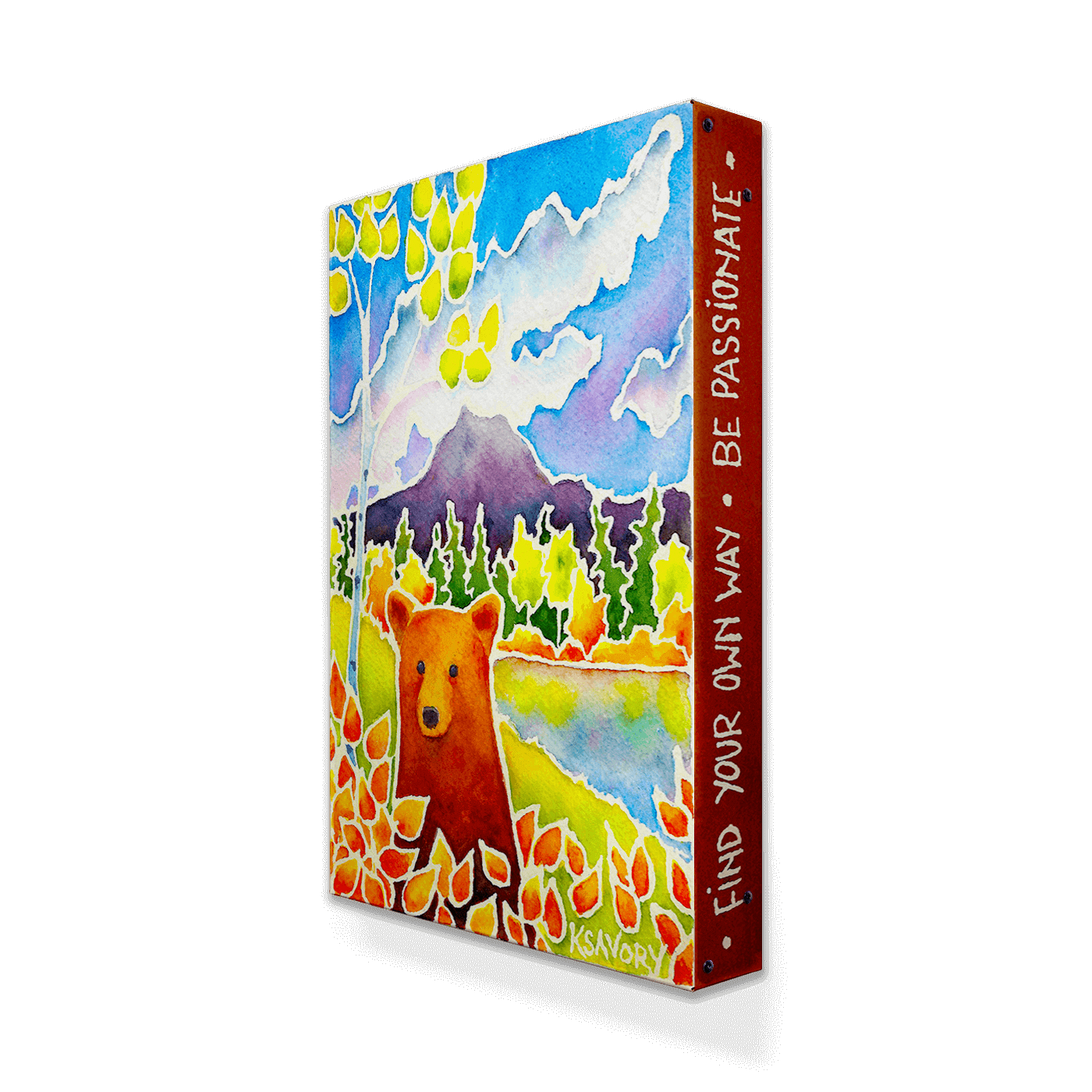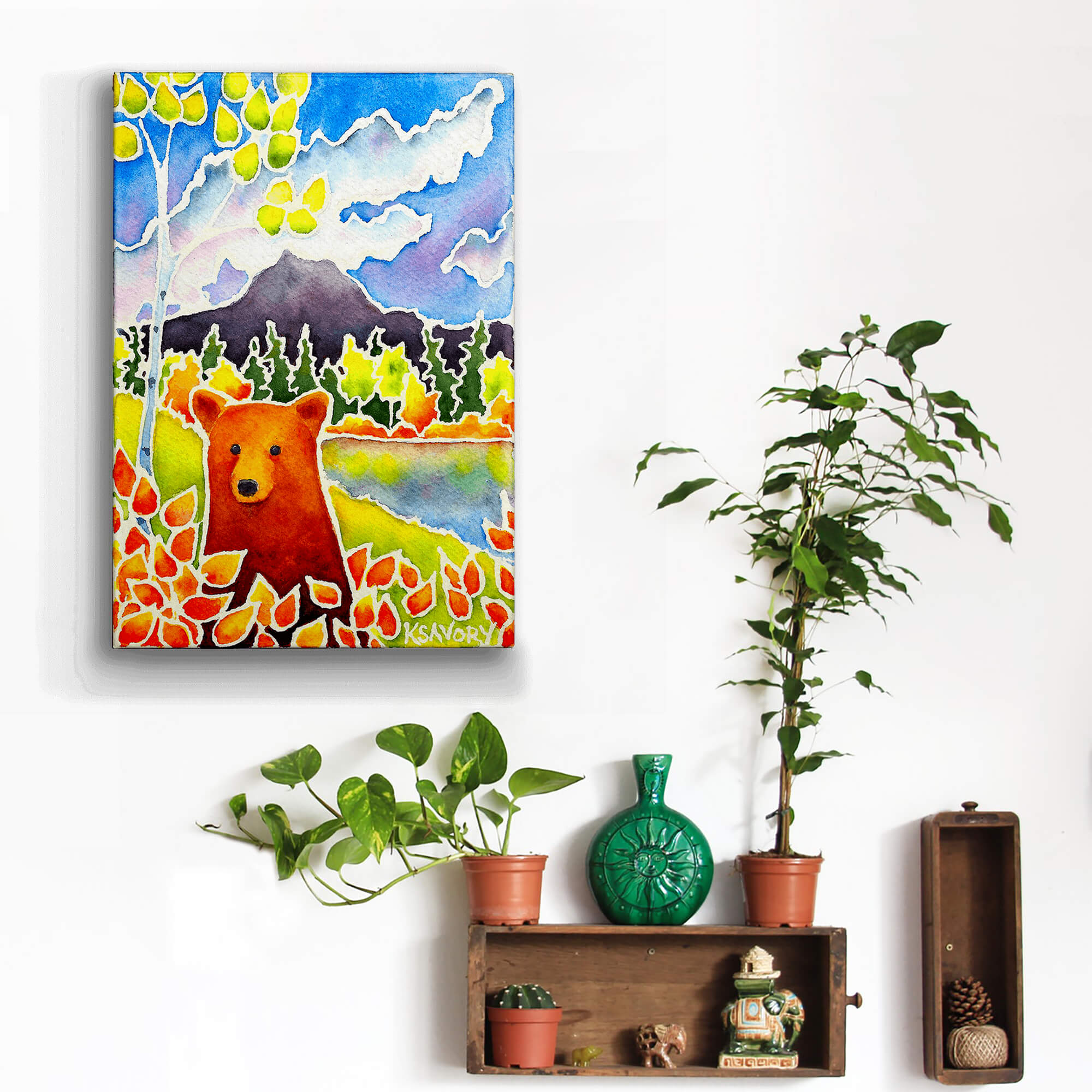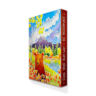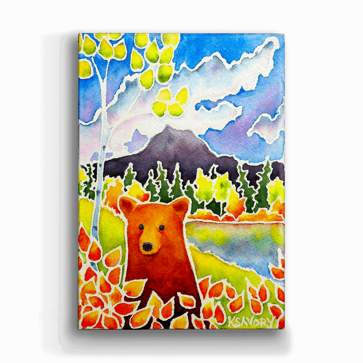 This vibrant watercolor painting brings to life a majestic bear set against the breathtaking landscape of a mountainous terrain. Surrounded by vivid autumn foliage, the bear stands out with its rich, warm hues against a backdrop of cool blues and greens, reflecting the serene beauty of a mountain lake. This artwork masterfully captures the essence of the changing seasons in the wild, making it a perfect addition to any collection for those who cherish nature and the outdoors.