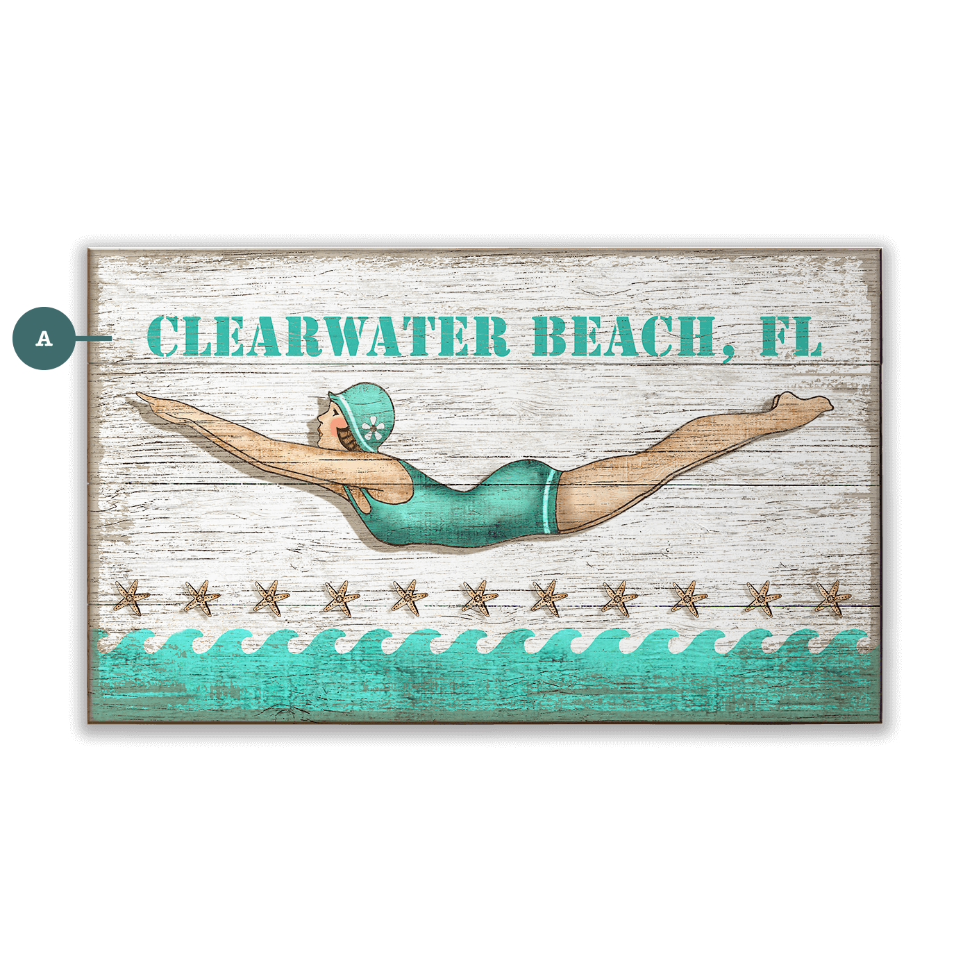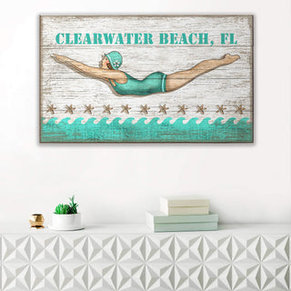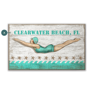 Dive into the vintage charm of Clearwater Beach with this vintage swimmer artwork. Capturing the timeless spirit of a classic swimmer against a rustic backdrop, this piece evokes the nostalgia of sunny days spent by the sea. The serene turquoise tones and subtle starfish accents make it an ideal addition to any coastal-themed room or beach house. Celebrate the joy of seaside escapes and the elegance of vintage style with this beautiful, eye-catching wall art.