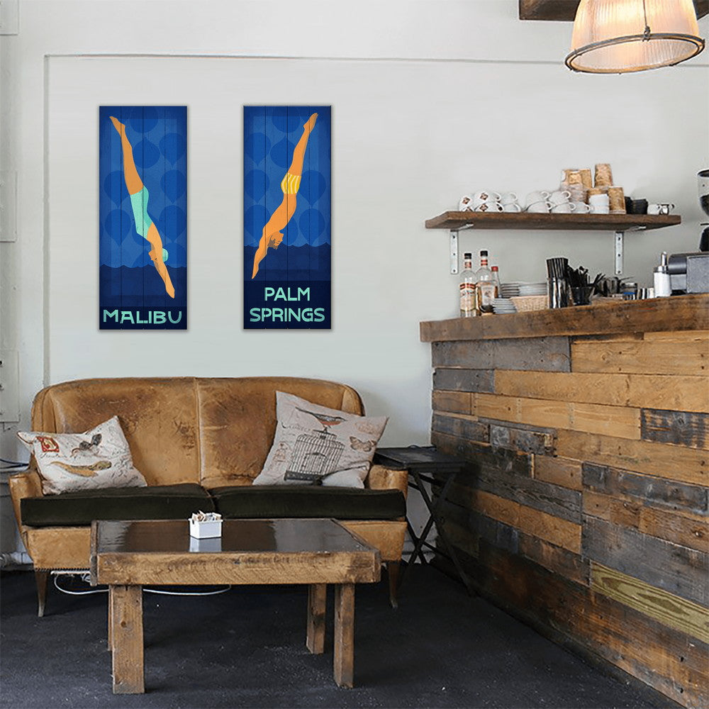 With sleek lines and cool sun-kissed blue tones, this minimalist design captures the moment just before splashdown. A poised diver, frozen mid-dive against a deep blue backdrop, channels the grace and thrill of summer days spent poolside or seaside. The bold composition and cool palette make it a striking celebration of movement, confidence, and coastal calm, making it a perfect addition for beach cottages, changing rooms, or any space that celebrates the freedom and joy of taking a swim.