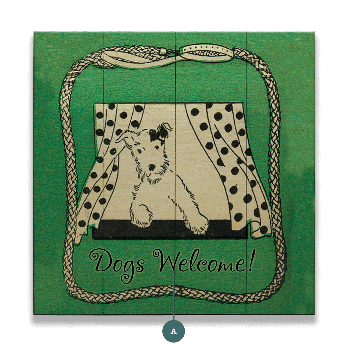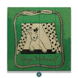 A charming and inviting piece, this sign warmly welcomes canine companions with a playful illustration of a dog peeking through a polka-dotted curtain. The hand-drawn style and vintage-inspired design make it a delightful addition to any dog-friendly home, shop, or café. Framed by a rope border and set against a bold green background, this sign captures the joy and companionship that dogs bring to our lives. Perfect for dog lovers who want to make it clear—furry friends are always welcome.