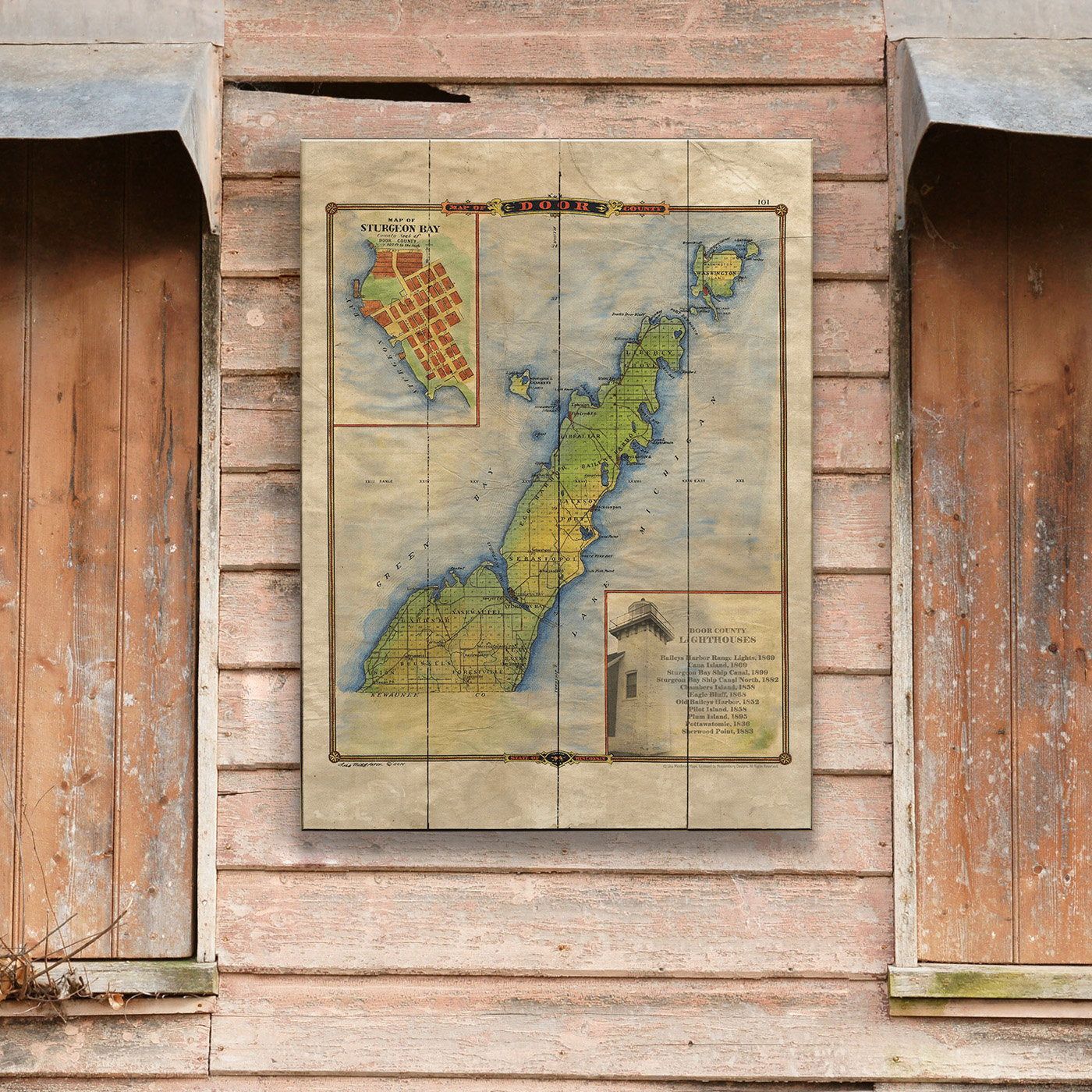 Immerse yourself in the historical allure of Door County, Wisconsin, with this meticulously detailed vintage-style map. This artwork showcases an elaborate depiction of Sturgeon Bay and the entire Door Peninsula, emphasizing its geographical beauty and nautical significance. The map is uniquely annotated with locations and founding dates of notable lighthouses like Baileys Harbor Range Light and Cana Island Light, reflecting the area’s rich maritime history.