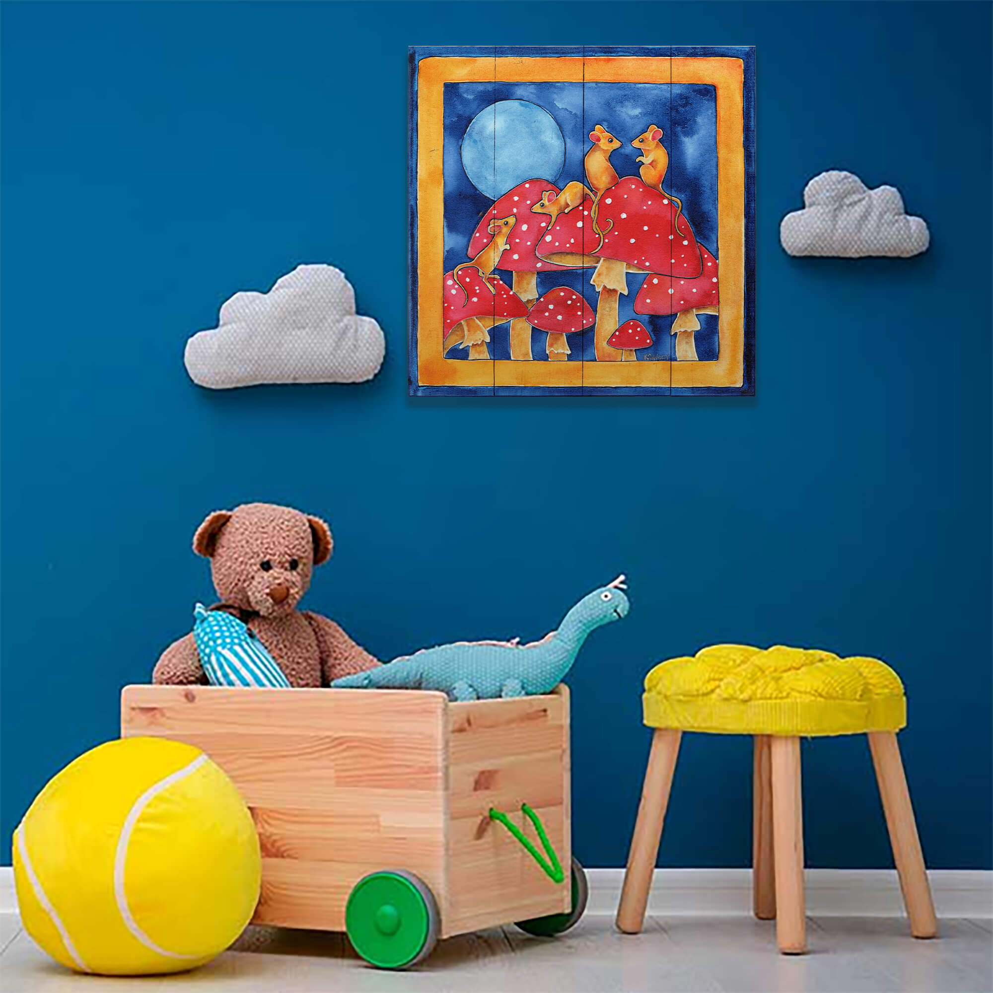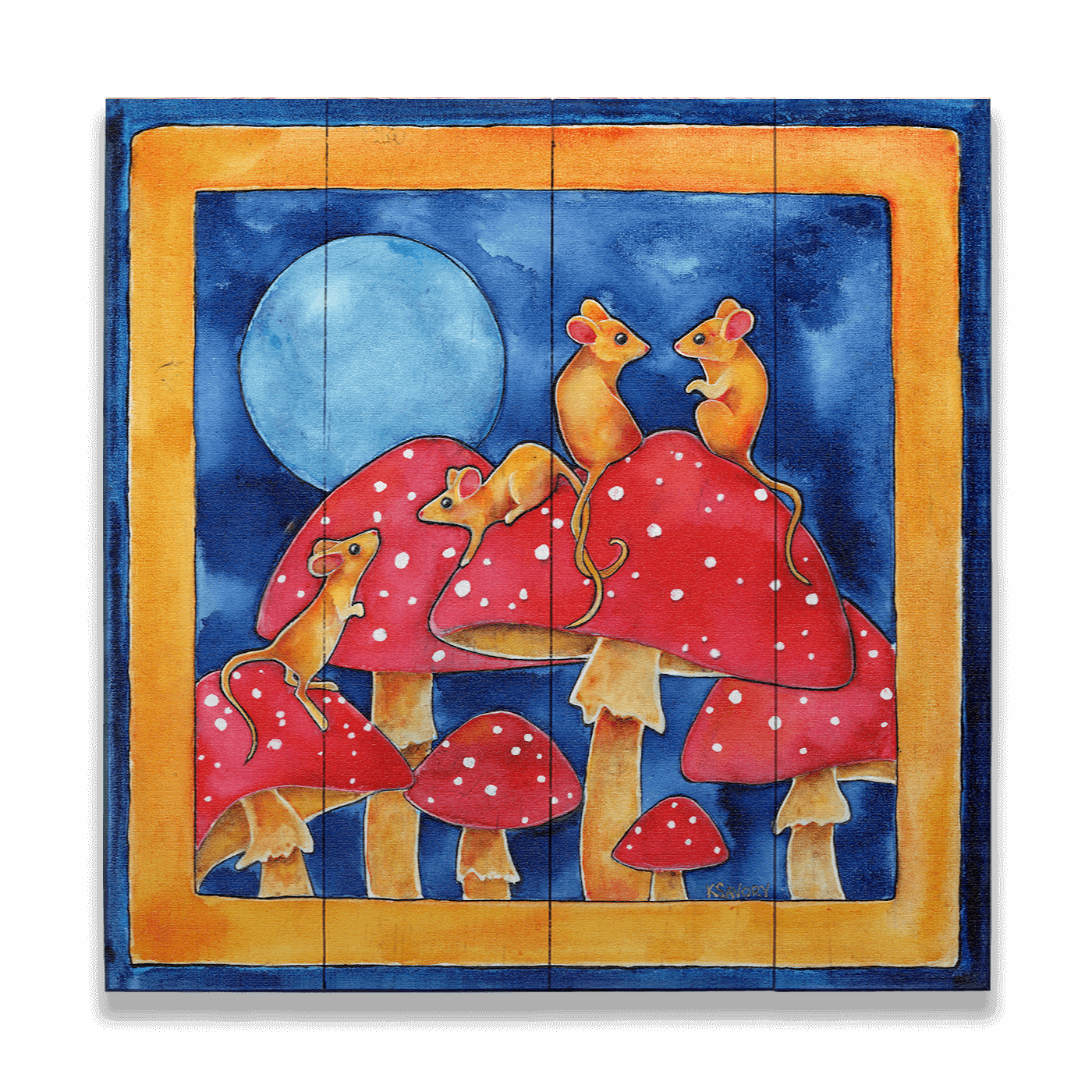 "Double Date" is a captivating artwork that showcases four mice on an adventurous outing atop striking red mushrooms under a glowing full moon. This charming piece, with its vivid colors and delightful details, offers a perfect blend of whimsy and enchantment. Ideal for those who appreciate imaginative themes, this painting adds a playful and cheerful touch to any space, inviting viewers to explore a world brimming with curiosity and joy.