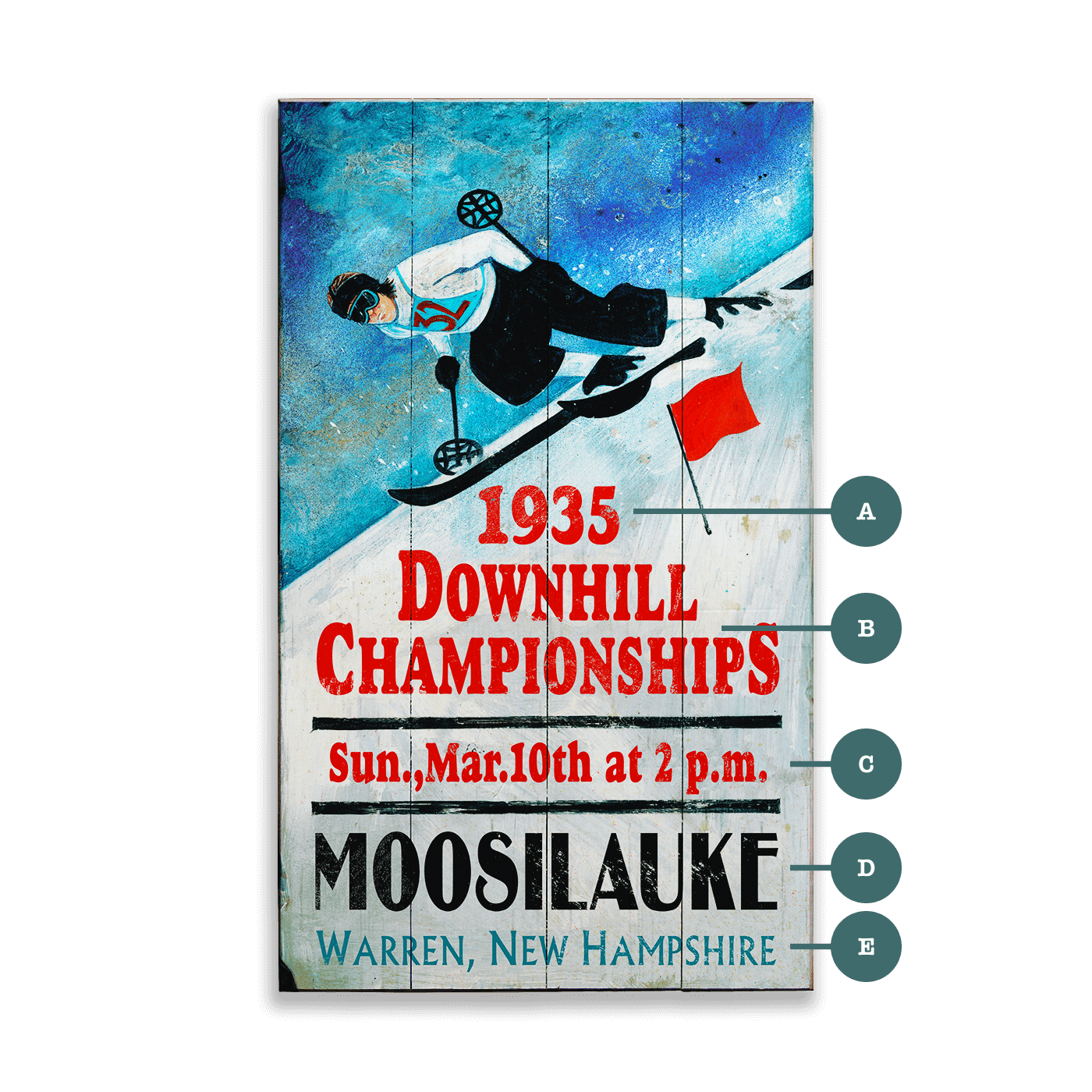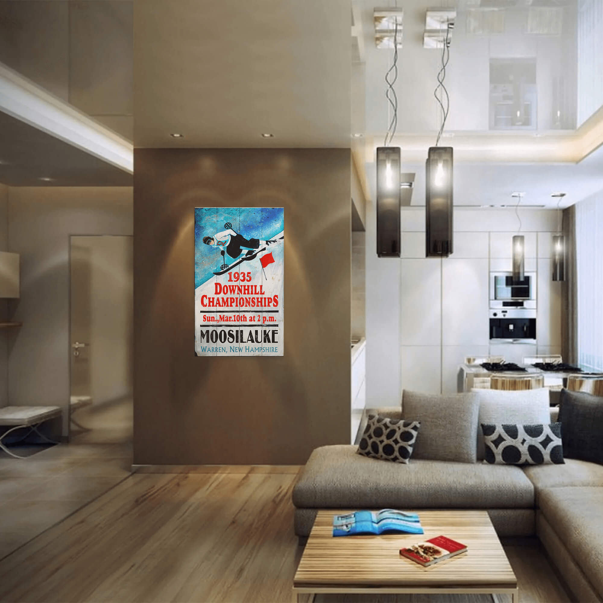 This vintage-style downhill skiing artwork captures the energy and thrill of a classic ski competition. Featuring a bold skier in action, the piece showcases a dynamic racing scene with vibrant colors and a nostalgic design. The distressed, weathered look adds a retro charm, making it perfect for winter sports enthusiasts and vintage décor lovers alike. Ideal for ski lodges, cabins, or anyone looking to add a touch of alpine adventure to their space, this artwork brings the excitement of downhill skiing to life.