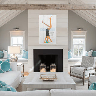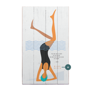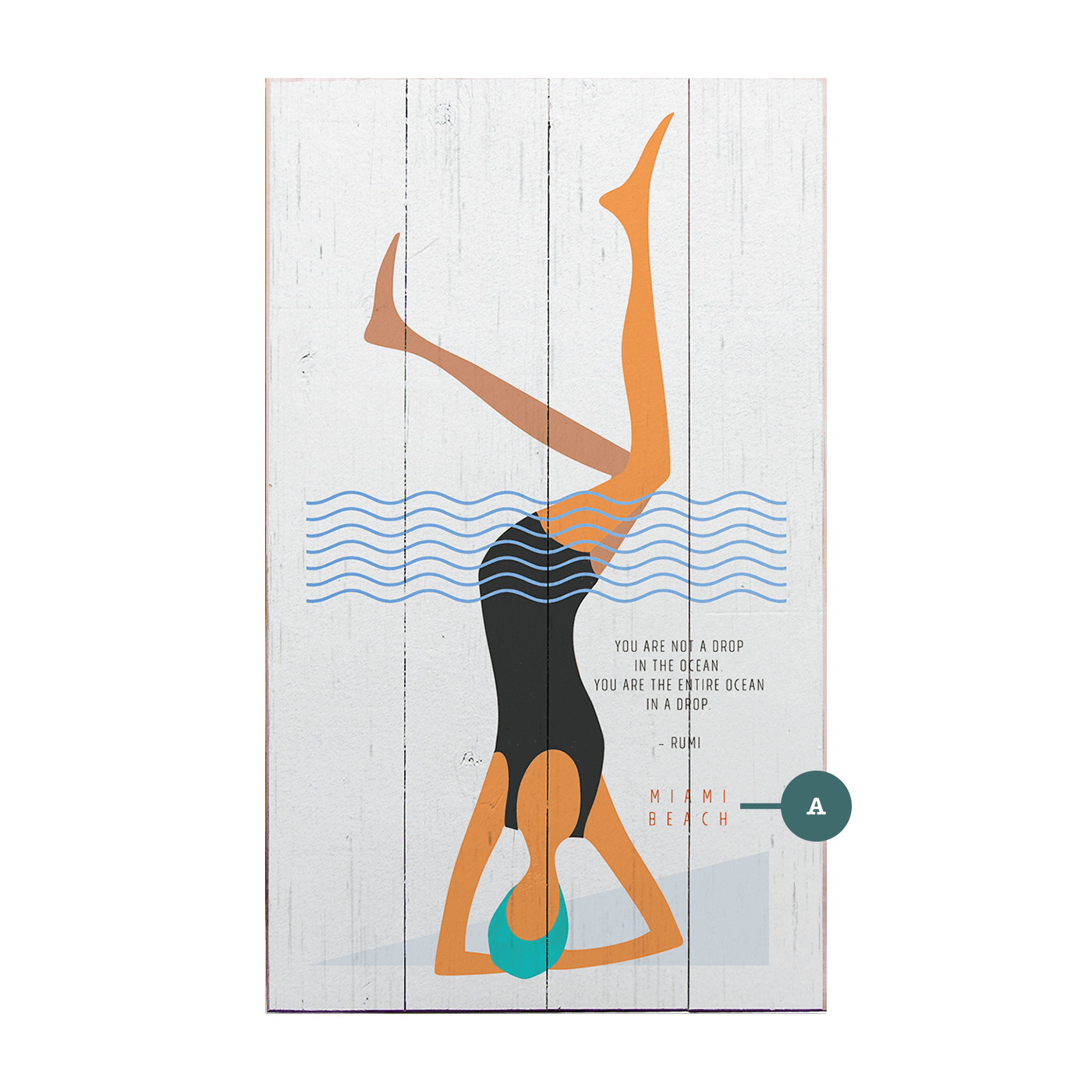 This striking artwork balances the elegance of form with the depth of reflection—literally and metaphorically. A lone figure holds a graceful headstand in the shallows, her silhouette slicing through a sea of gentle waves. Clean lines, minimal detail, and a limited color palette highlight the meditative stillness of the moment, while a quote by Rumi anchors the piece with poetic weight: “You are not a drop in the ocean. You are the entire ocean in a drop.” It’s an image of personal strength, serenity, and connectedness—perfect for spaces that celebrate mindfulness, movement, and the healing rhythm of the sea.