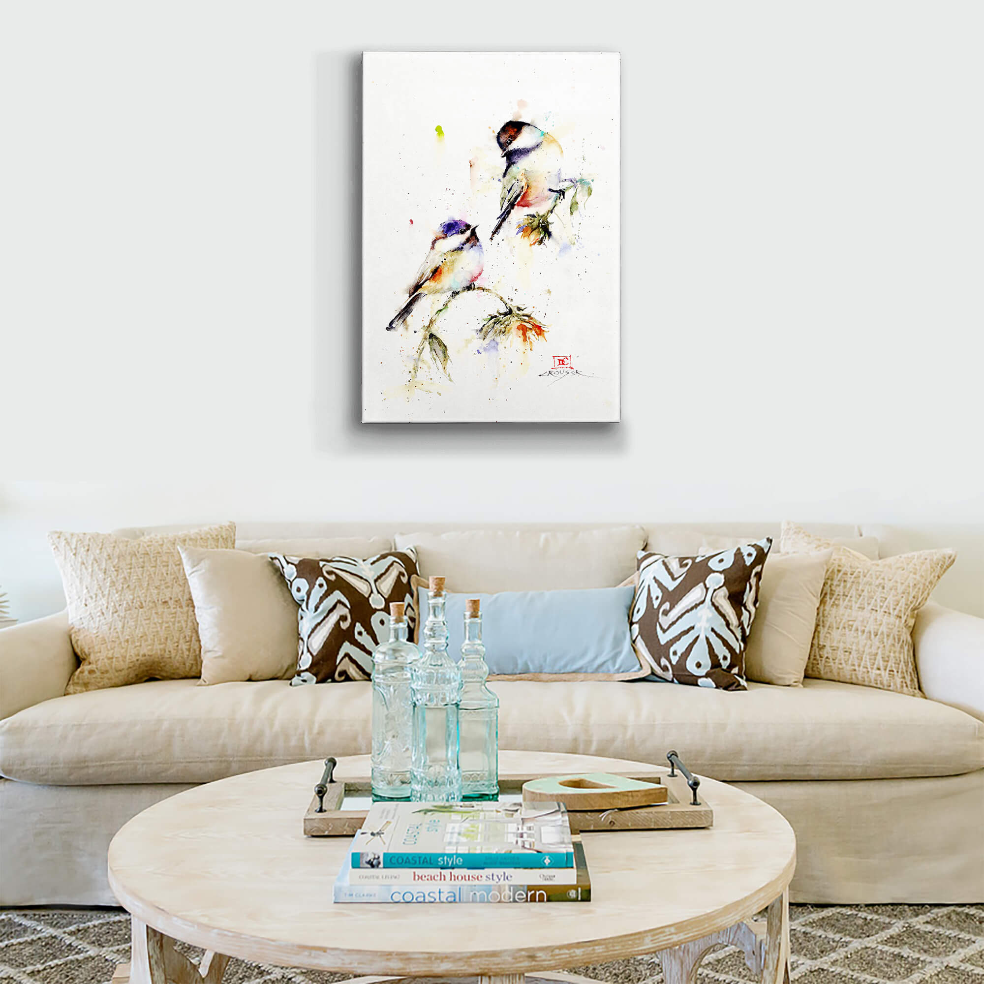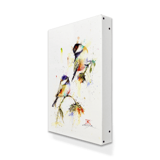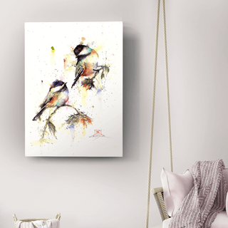 Immerse yourself in the serene beauty of "Dropping In," a stunning watercolor painting that captures the delicate charm of chickadees perched on a branch. This artwork beautifully blends vivid splashes of color with fine details, evoking a sense of tranquility and the fleeting nature of a brief visit. The expressive brushwork and light, airy composition make it a delightful addition to any space seeking a touch of nature's quiet elegance. Ideal for bird lovers and art aficionados alike, "Dropping In" invites you to enjoy a moment of peace and artistic finesse.