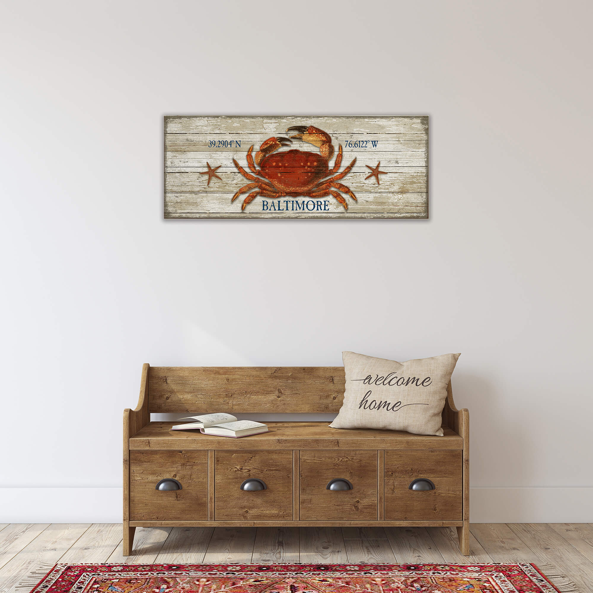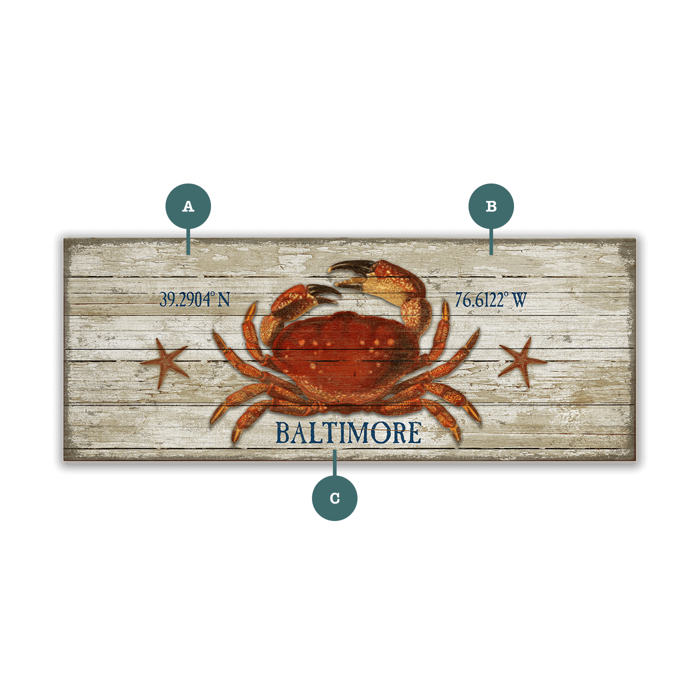 This rustic wall art showcases a vibrant dungeness crab and two starfish on a distressed background, bringing coastal charm and a nautical feel to any space. The weathered look adds a vintage touch, making it perfect for beach lovers or anyone looking to enhance their décor with marine life. The design creates a timeless and eye-catching piece that fits well in a variety of spaces. Ideal for those seeking to add a coastal vibe to their home or office.
