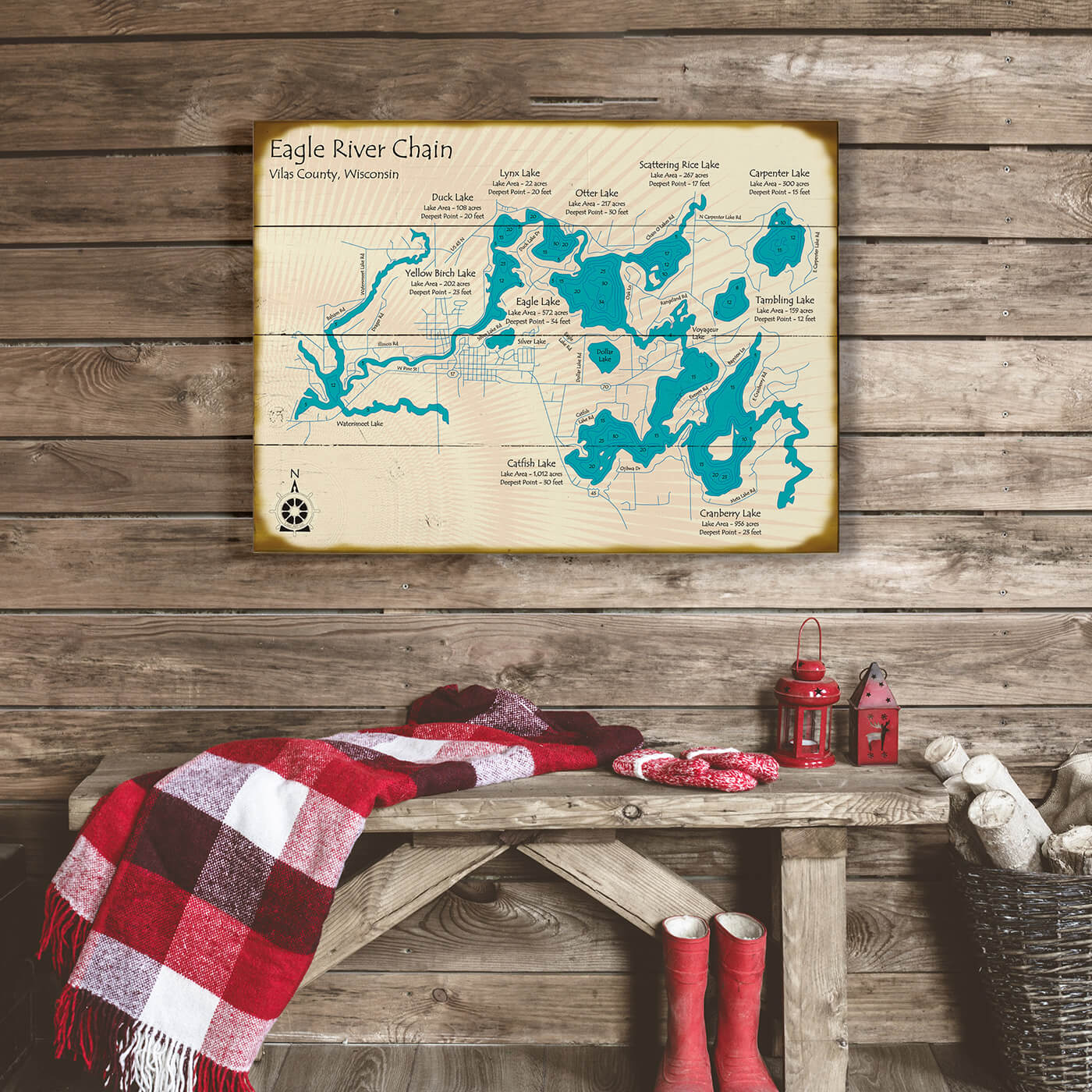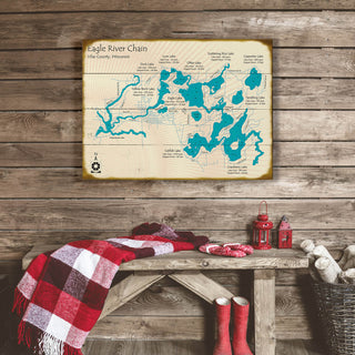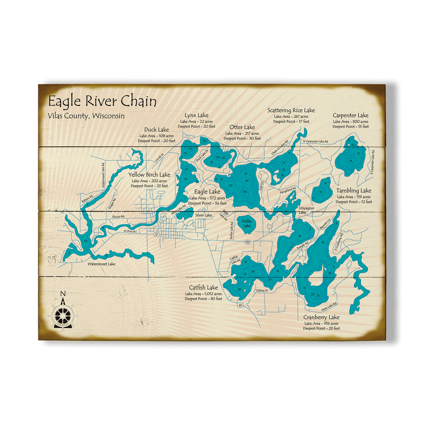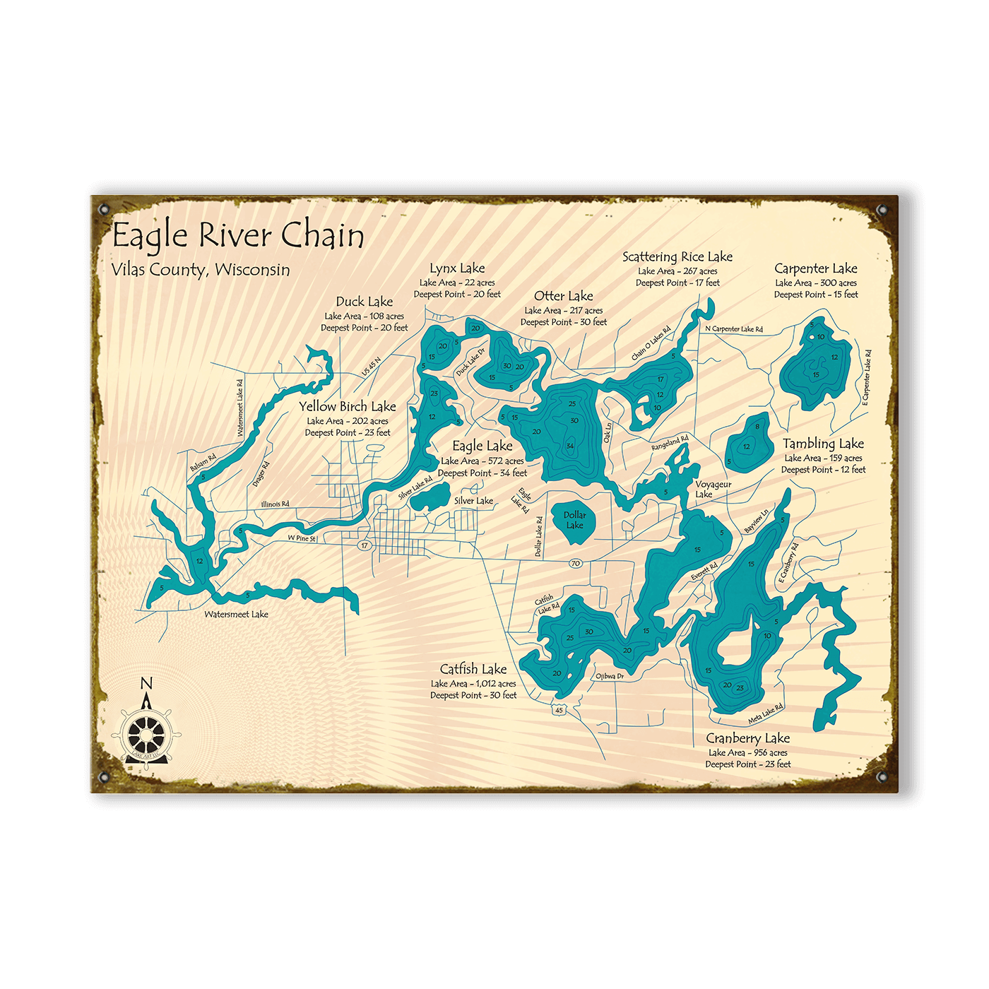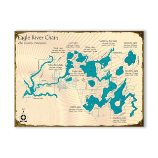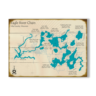 Introducing our exquisite decorative vintage map of the Eagle River Chain Lakes in Wisconsin - a stunning portrayal of the area's natural beauty, wildlife, and history. Made up of over a dozen lakes, including Yellow Birch Lake, Duck Lake, Lynx Lake, Otter Lake, Catfish Lake, Cranberry Lake, Tambling Lake, Carpenter Lake, and Scattering Rice Lake, the Eagle River Chain Lakes are home to a diverse range of wildlife, this map is a tribute to the richness of the natural world. Crafted with care and attention to detail, this vintage map is a piece that's sure to spark conversation and inspire awe.