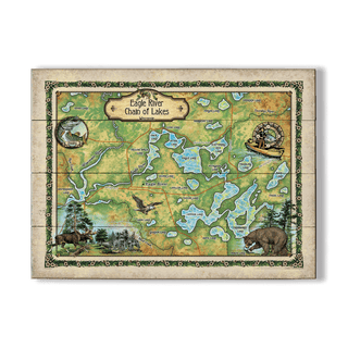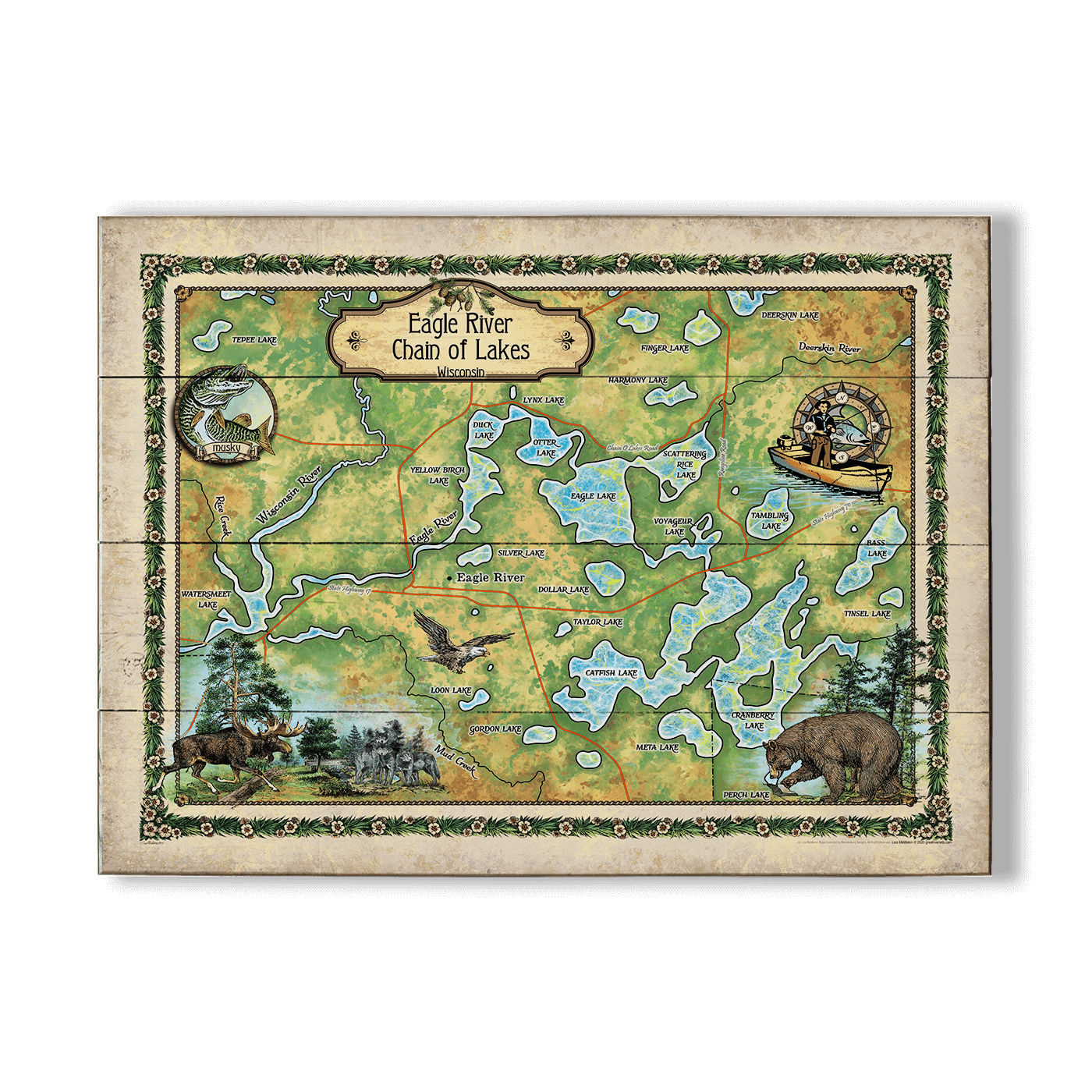 Discover the serene beauty of Wisconsin's Eagle River Chain of Lakes through this artistically rendered map. Perfect for outdoor enthusiasts and lovers of nature, this map highlights the interconnected waterways and scenic landscapes of Eagle River. Illustrated with vivid depictions of local wildlife and rustic scenes, this map not only serves as a guide for adventurers but also as a stunning piece of art. Ideal for those who cherish the outdoors and the natural splendor of Wisconsin, it's a splendid addition to any home, office, or collection.