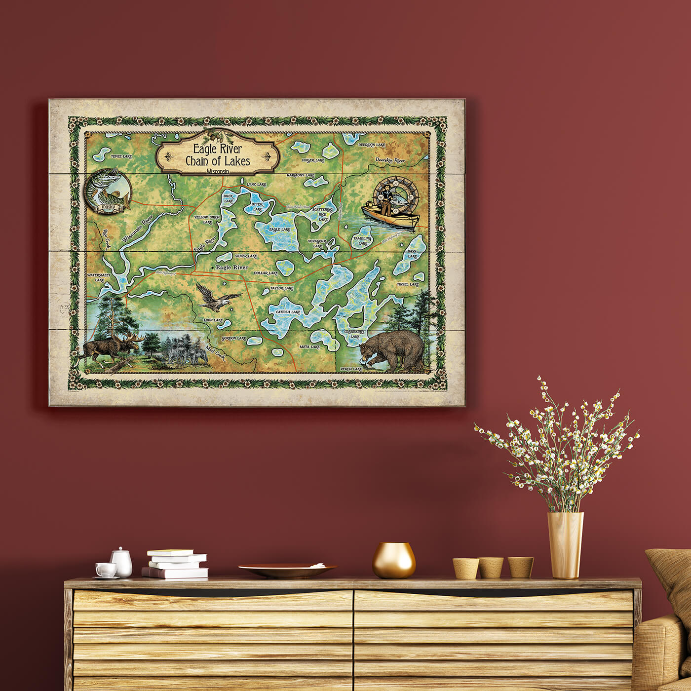 Eagle River Chain of Lakes: Illustrated Map - Wood & Metal Wall Art
