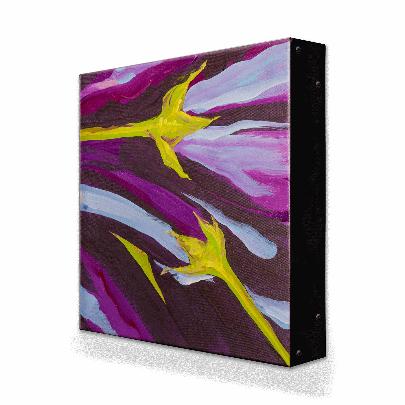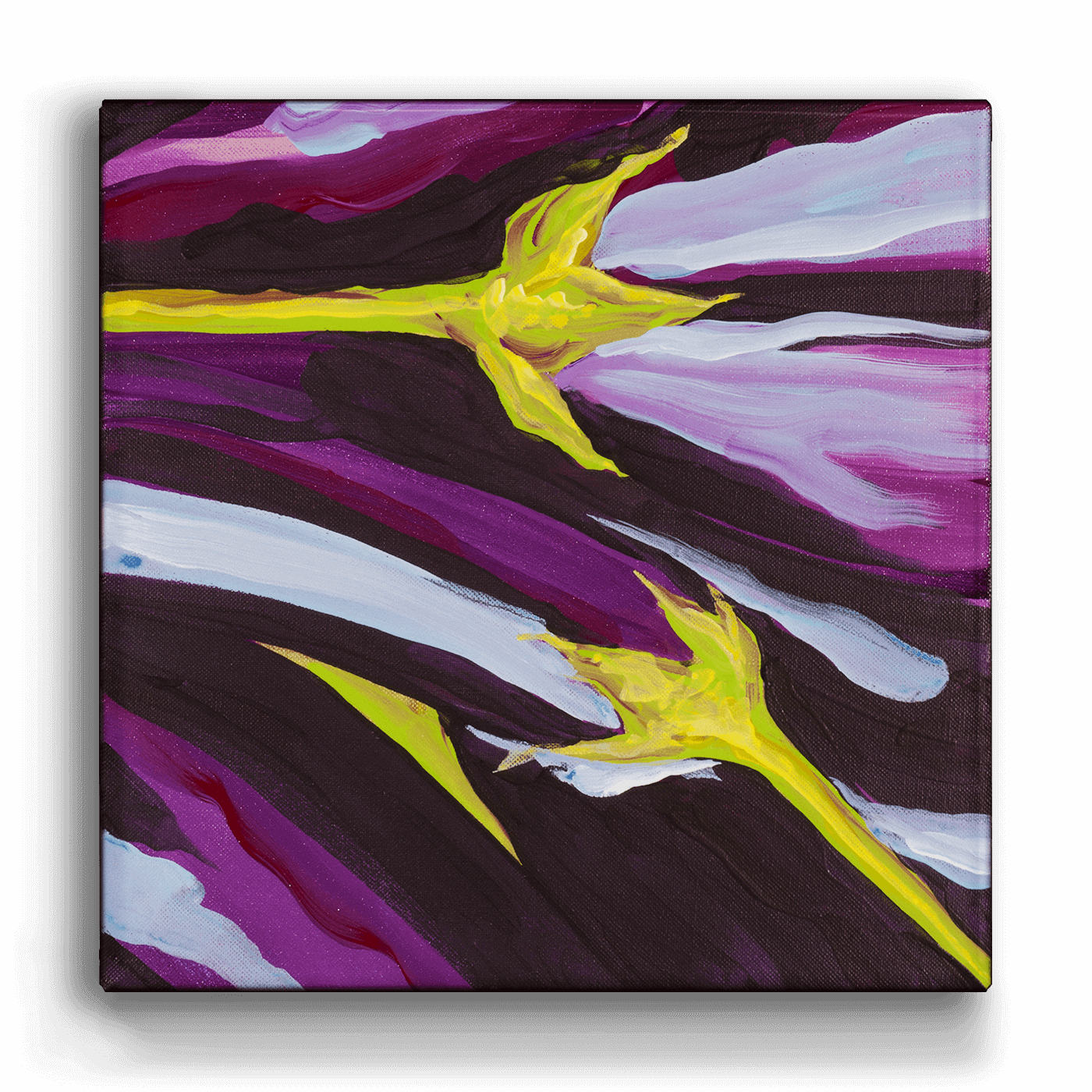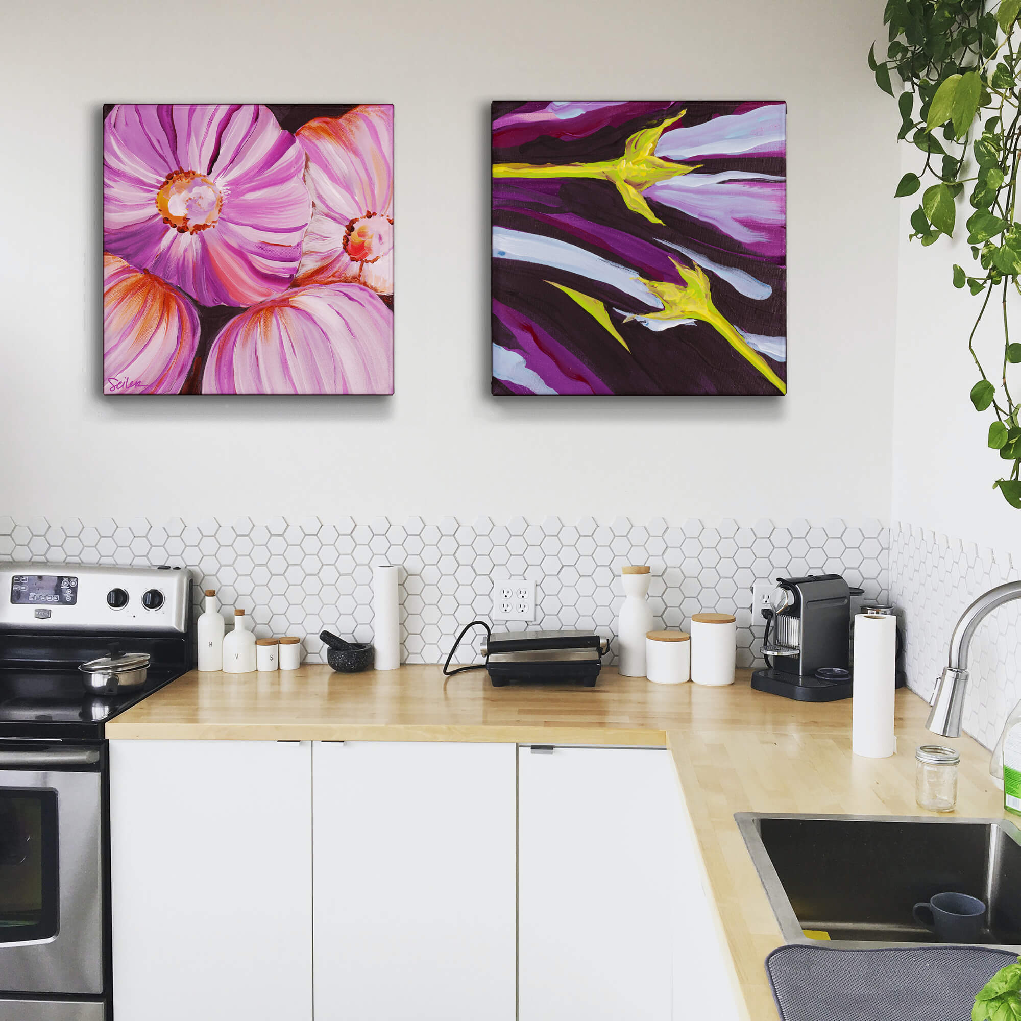 Enliven your walls with this bold and abstract rendition of an eggplant's essence. This piece captures the dynamic interplay of deep purples and striking yellows, conveying the sleek, smooth textures and contours of the eggplant. It's a contemporary take that celebrates the beauty and drama of vegetables in a way that's sure to spark conversation and admiration in any modern kitchen or dining space.