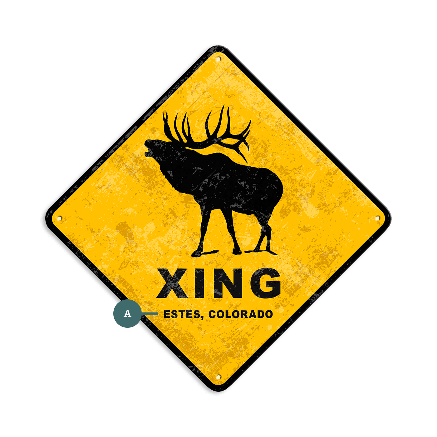 Add a wild touch to your space with this bold elk crossing sign, featuring a high-contrast silhouette and a distressed finish that evokes weathered backcountry roads. The classic caution-yellow background instantly grabs attention, while the textured wear gives it a timeworn, authentic feel. Whether you're decorating a mountain retreat, cozy cabin, or rustic garage, this piece channels the spirit of the great outdoors and brings a playful reminder to respect the wildlife that roams free.