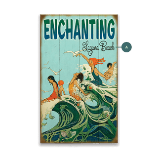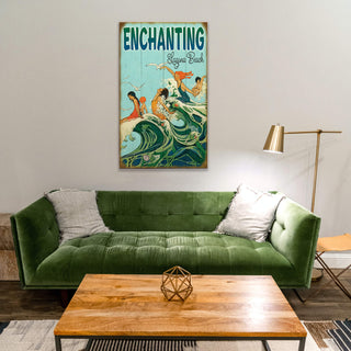 This captivating piece titled "Enchanting Beach" transports viewers to the sunlit shores through its vibrant and playful portrayal of people riding the cresting waves. Merging whimsical fantasy with coastal charm, this artwork captures the free-spirited essence of the beach, making it a perfect decorative statement for those who adore nautical themes and vintage-style illustrations. Ideal for enhancing the ambiance of any seaside cottage or beach house decor, it brings a splash of magic and nostalgia to your living space.