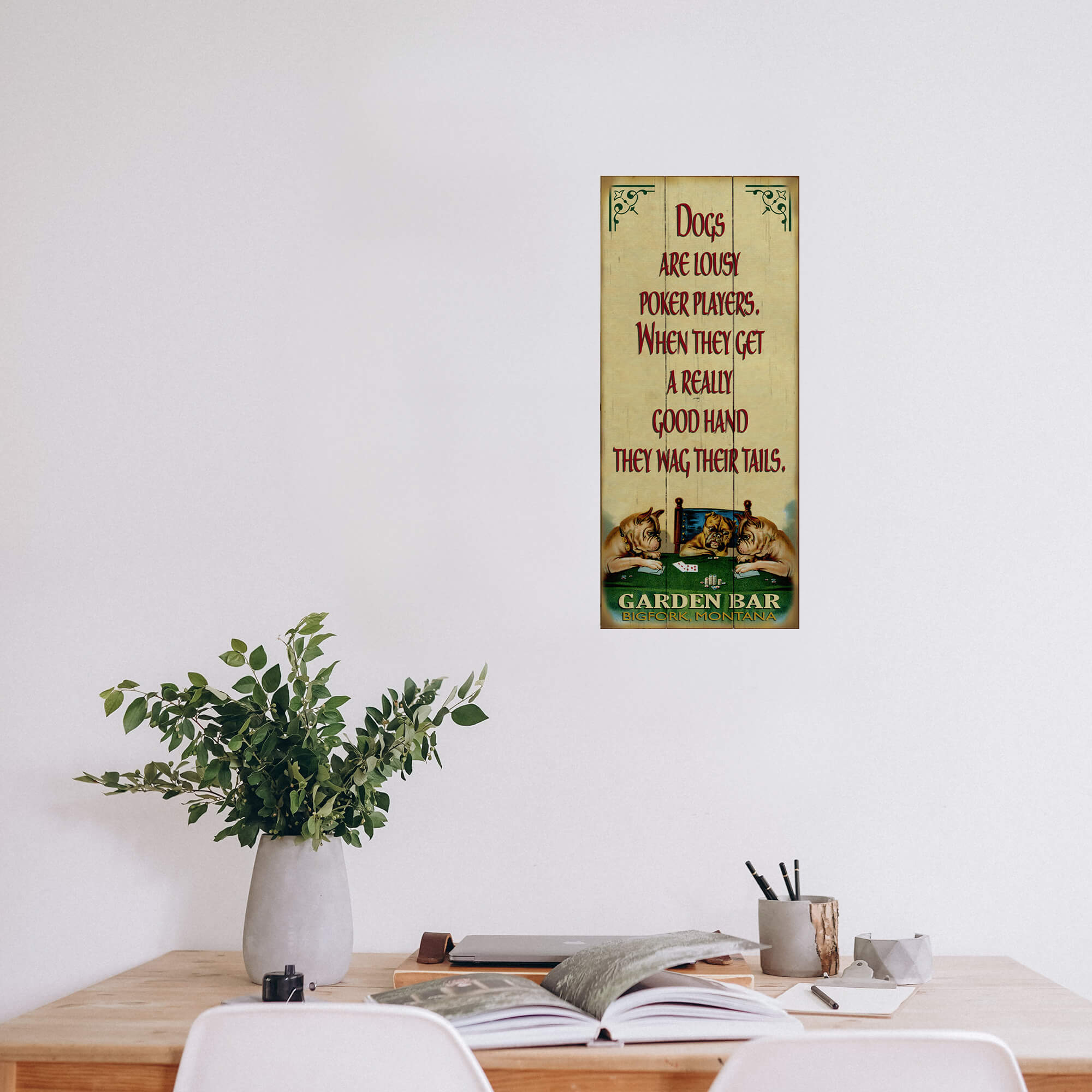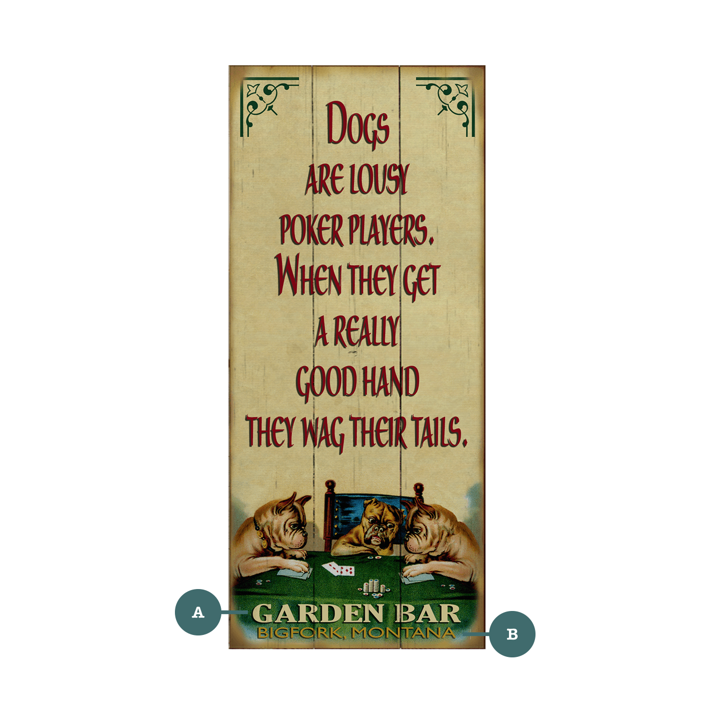 This humorous sign brings a lighthearted touch to any space, featuring a witty poker-themed quote about dogs and their telltale tails. The charming artwork below showcases three expressive pups gathered around a poker table, surrounded by cards and chips, adding a fun and whimsical appeal. With its vintage-inspired design and playful theme, this piece is a perfect addition to a bar, game room, or any space where good company and laughter are welcome.