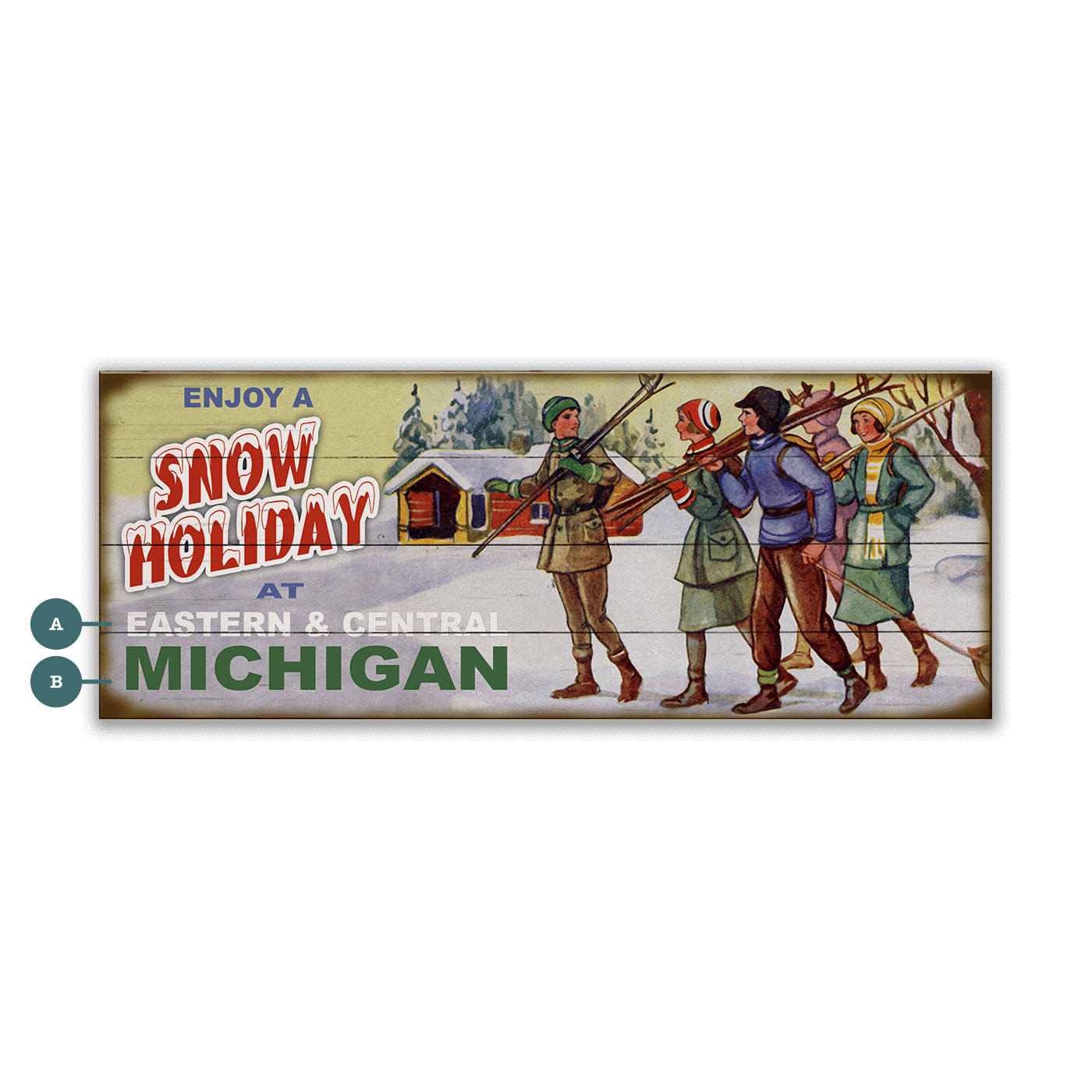 This artwork evokes the charm of a classic winter getaway, featuring a cheerful group of skiers making their way toward a cozy cabin nestled in a snowy landscape. The vibrant colors and detailed composition capture the spirit of camaraderie and the simple joys of a snow holiday. With its inviting design, this piece celebrates the beauty of winter recreation and the warm sense of togetherness that comes with a trip to the snowy outdoors. Perfect for lovers of winter escapes, it brings a nostalgic yet timeless energy to any space.