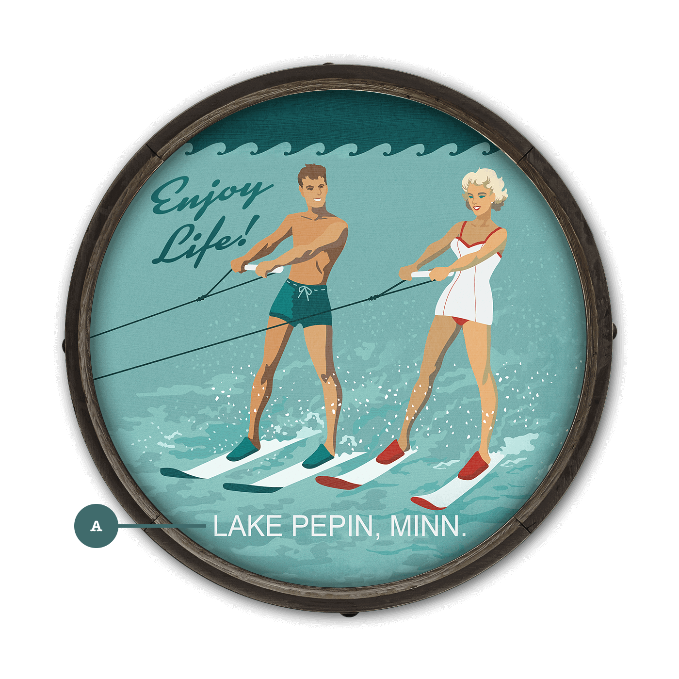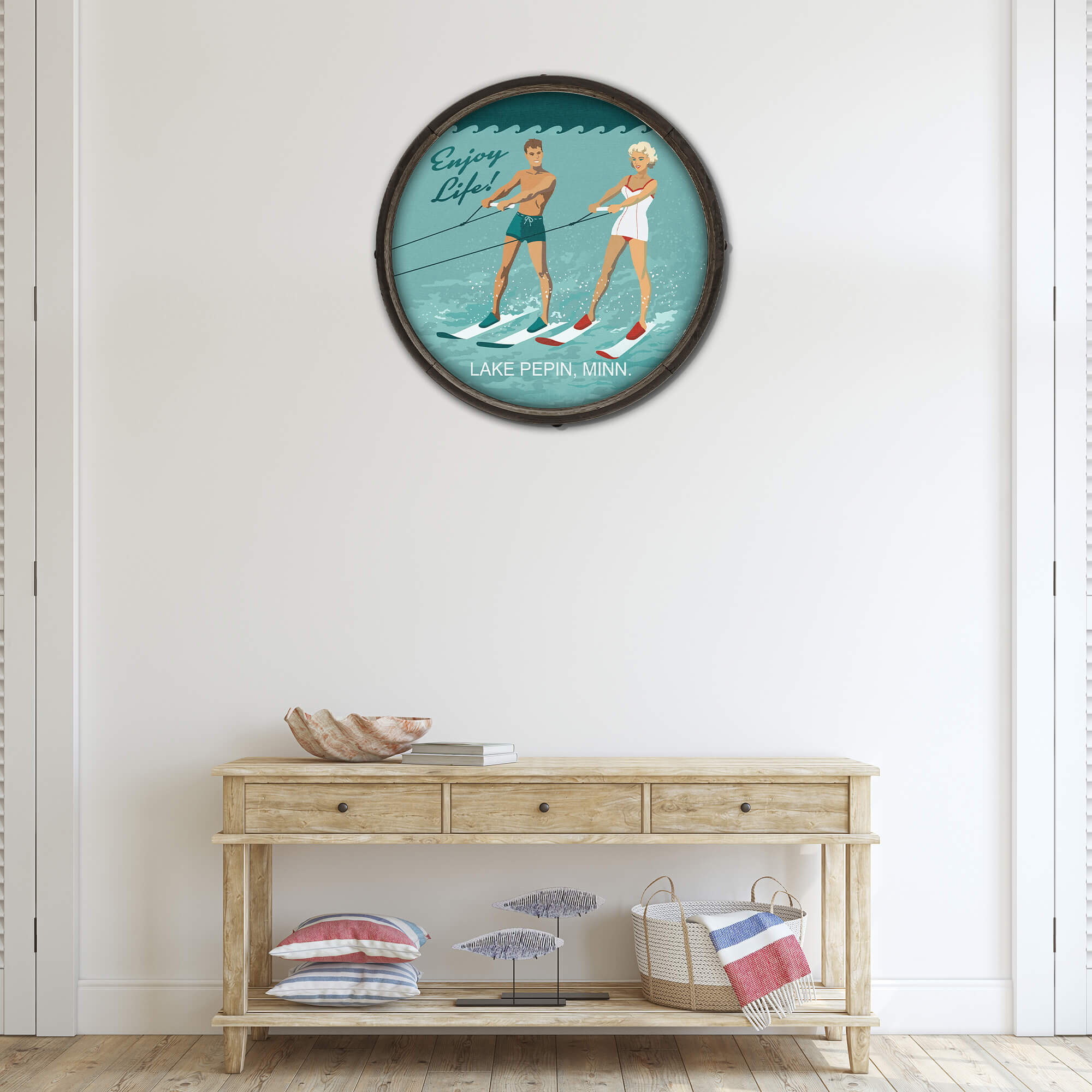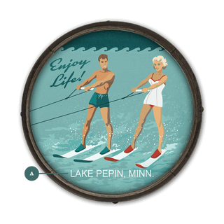 This vibrant vintage-style print invites you to "Enjoy Life!" with a captivating scene of water skiing on Lake Pepin, Minnesota. The artwork features a man and a woman gracefully gliding over the waves, exuding a sense of fun and freedom. Perfect for those who appreciate nostalgic travel posters or are looking to add a touch of retro charm to their decor.