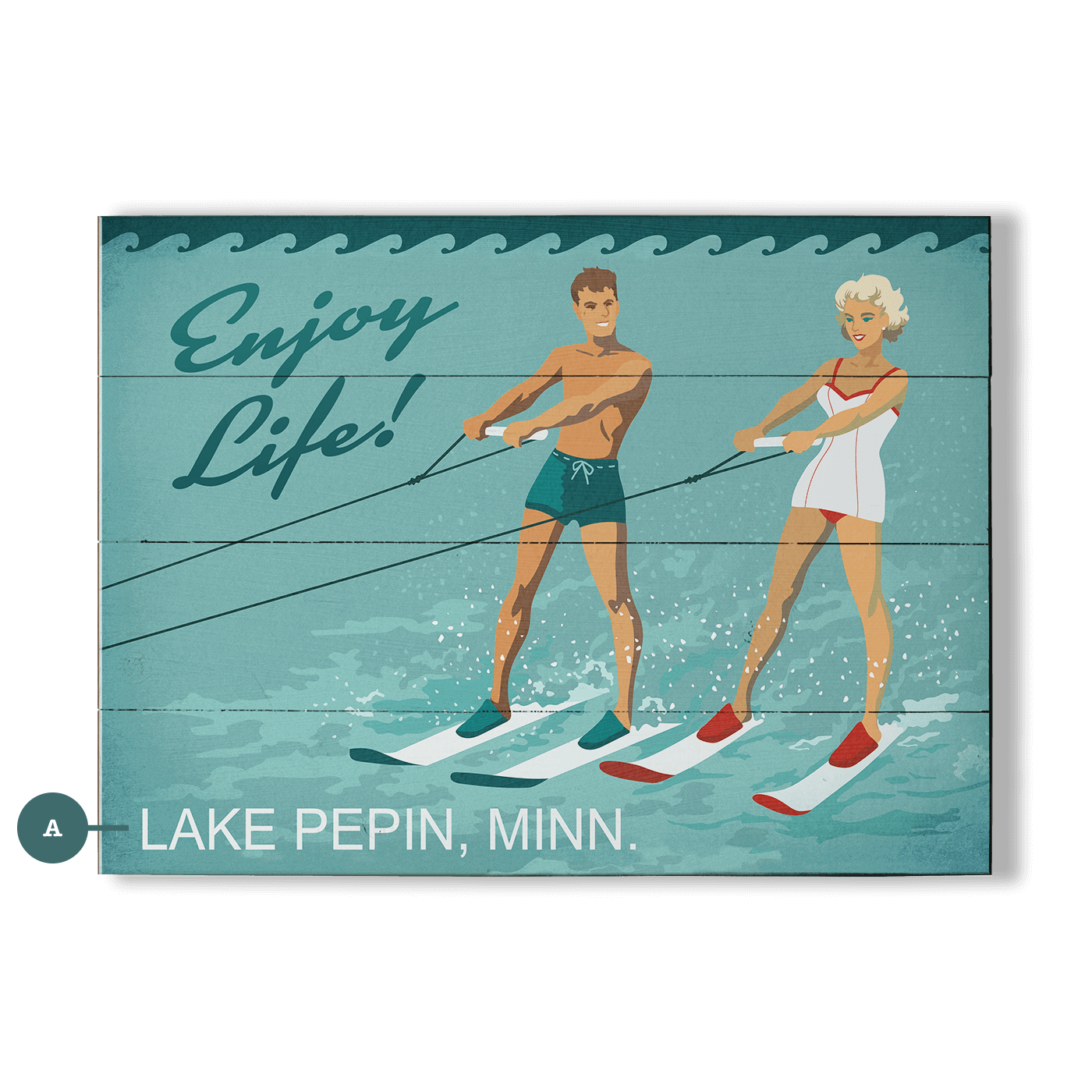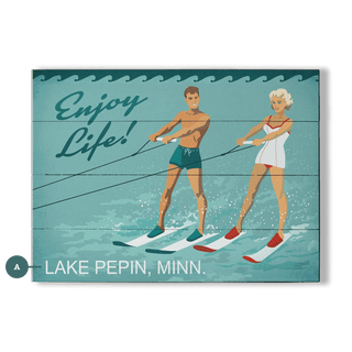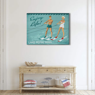 This vibrant vintage-style print invites you to "Enjoy Life!" with a captivating scene of water skiing on Lake Pepin, Minnesota. The artwork features a man and a woman gracefully gliding over the waves, exuding a sense of fun and freedom. Perfect for those who appreciate nostalgic travel posters or are looking to add a touch of retro charm to their decor.