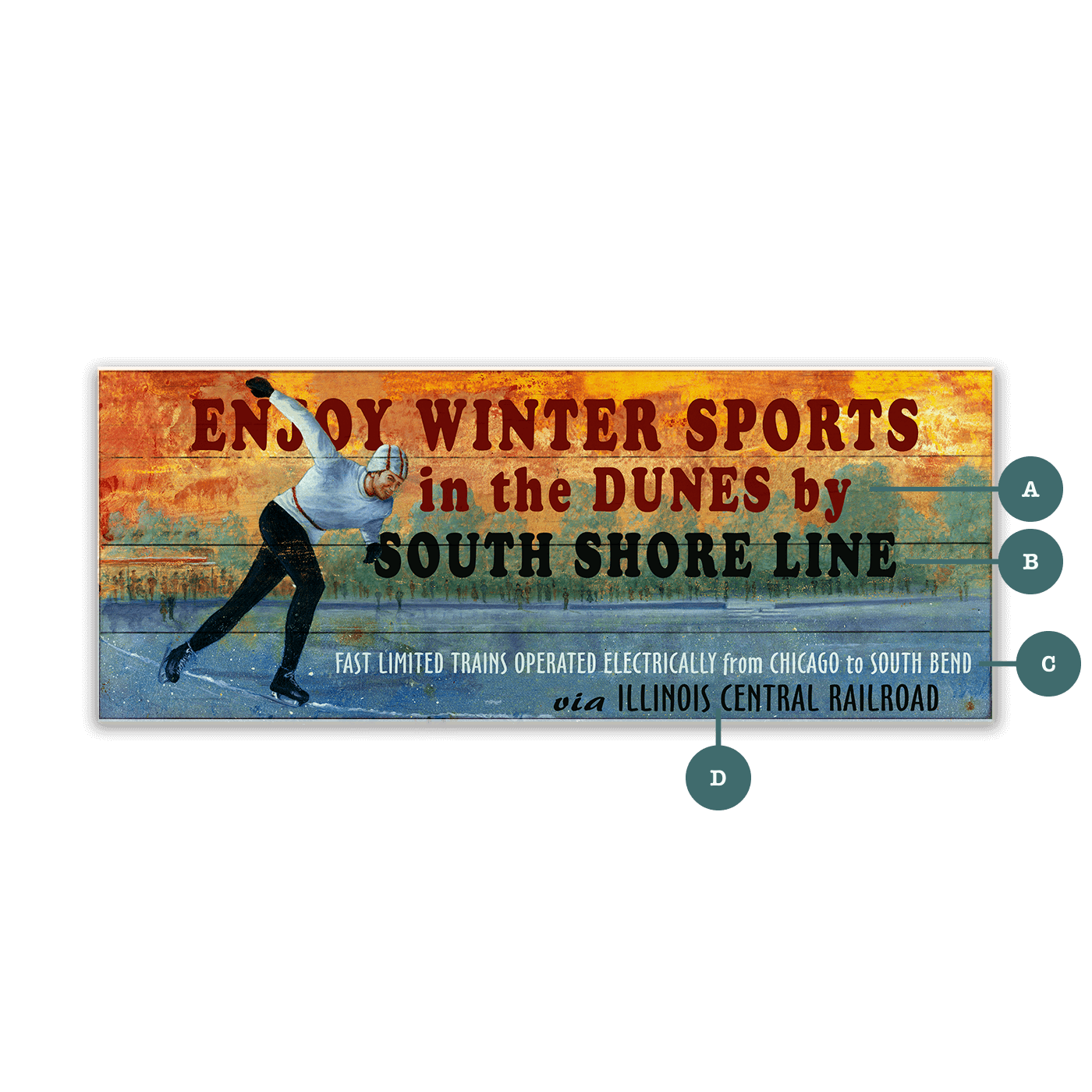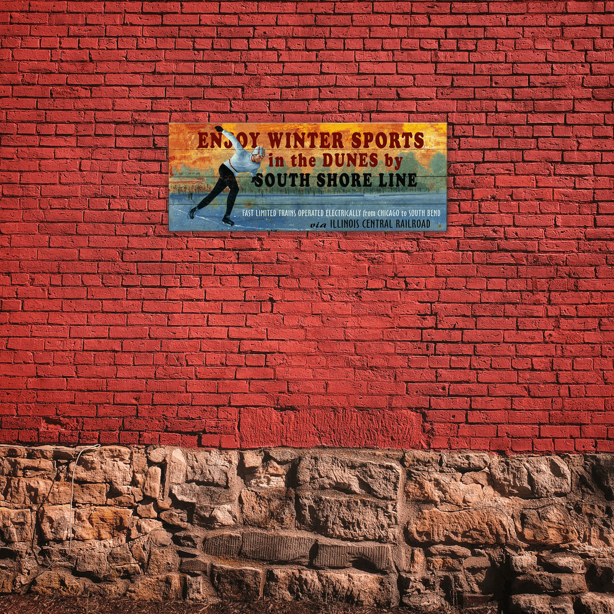 This vintage winter sports artwork brings the excitement of outdoor activities to life with a dynamic ice skating scene. Featuring a nostalgic design with vibrant colors and a weathered finish, this piece evokes the charm of classic winter getaways. Perfect for adding a retro touch to cabins, lodges, or home décor, it captures the fun and adventure of winter recreation.
