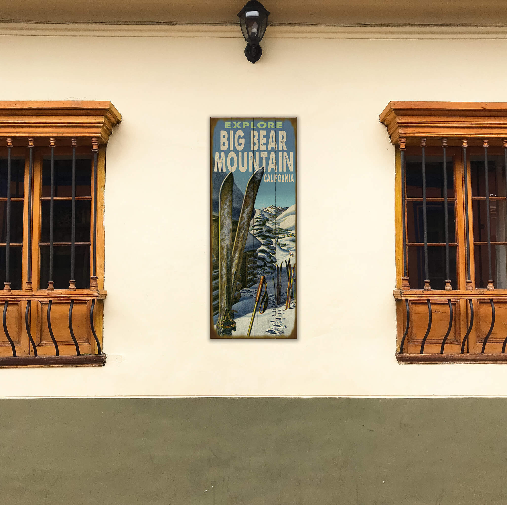 Invite viewers to explore the peaceful beauty of a snowy mountain escape with this cozy artwork. A pair of well-worn skis stand in the foreground in front of a rustic log cabin, evoking the charm of a classic alpine adventure. Snow-covered peaks and frosted trees stretch across the background under a soft, blue sky, capturing the quiet stillness of the winter wilderness. Perfectly blending nostalgia and exploration, this piece celebrates the call of the mountains and the joy of discovering untouched snowy trails.