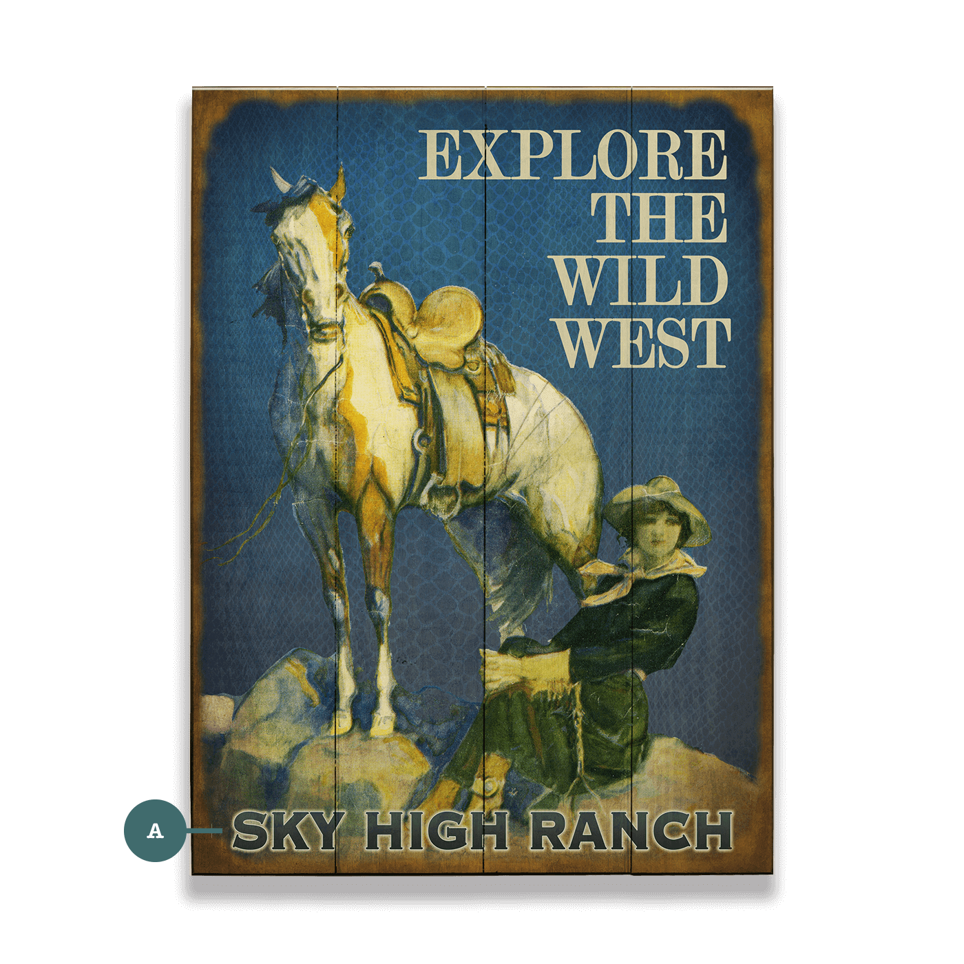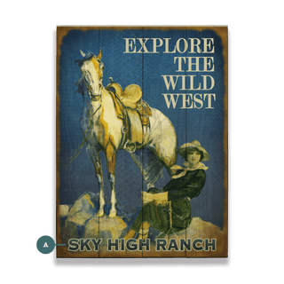 This vintage-style artwork captures the spirit of adventure and the untamed beauty of the Wild West. Featuring a striking image of a poised cowgirl resting beside her saddled horse atop a rugged landscape, the piece evokes a sense of exploration and independence. The rich, weathered tones and distressed finish add an authentic, nostalgic charm reminiscent of classic western travel posters. Perfect for those who love the cowboy way of life, equestrian culture, or rustic decor, this artwork brings the romance of the open range into any space.