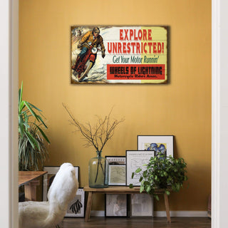 Unleash your spirit of adventure with this dynamic vintage-style print. The artwork features a bold depiction of a classic motorcyclist in full gear, powering through rough terrain, embodying the thrill of unrestricted exploration. With its vibrant colors and action-packed imagery, this poster not only captures the essence of freedom on the open road but also serves as a perfect wall accent for enthusiasts and collectors alike.