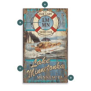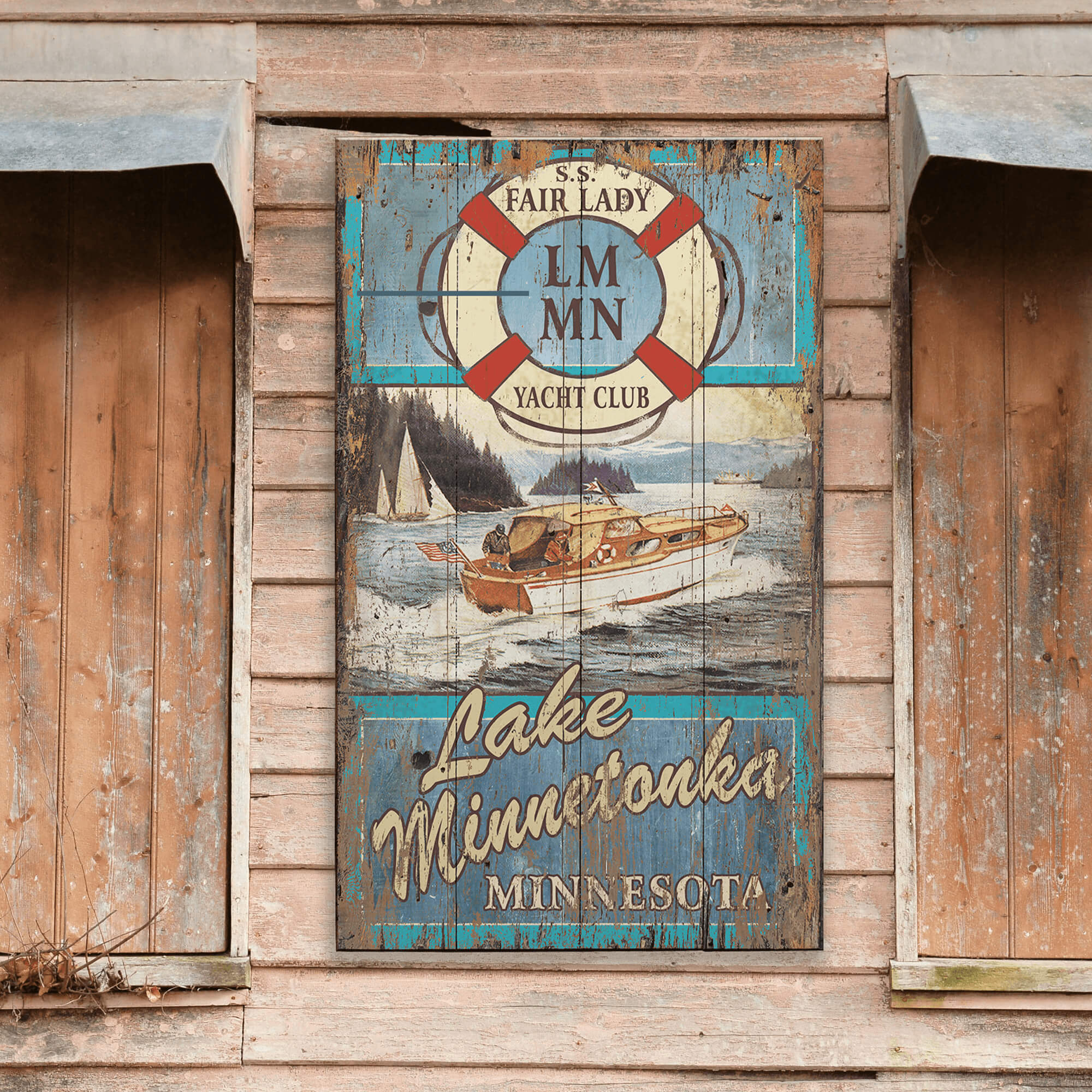 This vintage-style artwork features a classic yacht cruising along a scenic lake, capturing the charm of leisurely summer boating. With its retro design, distressed finish, and nautical theme, it evokes nostalgia for yacht clubs and lakeside getaways. Perfect for adding a touch of rustic elegance to cabins, boathouses, or coastal-themed decor, it brings a sense of timeless waterfront adventure to any space.