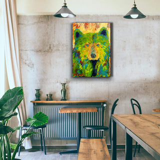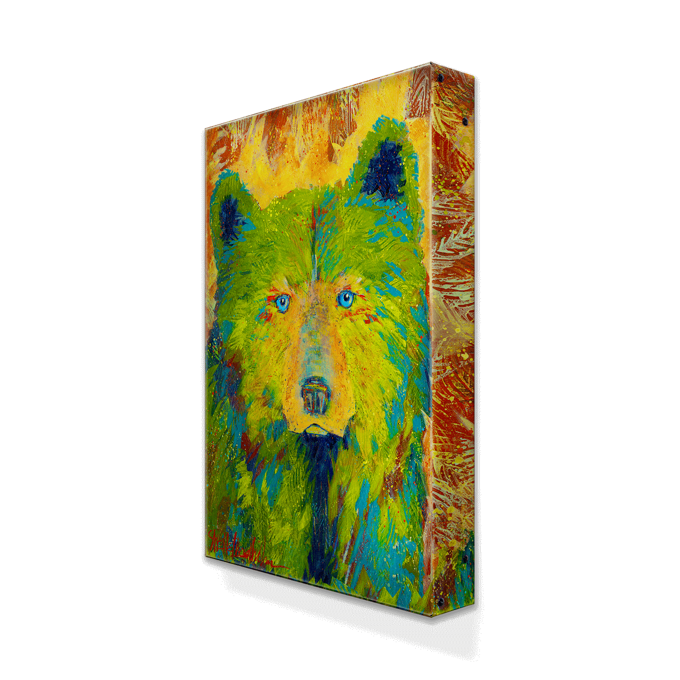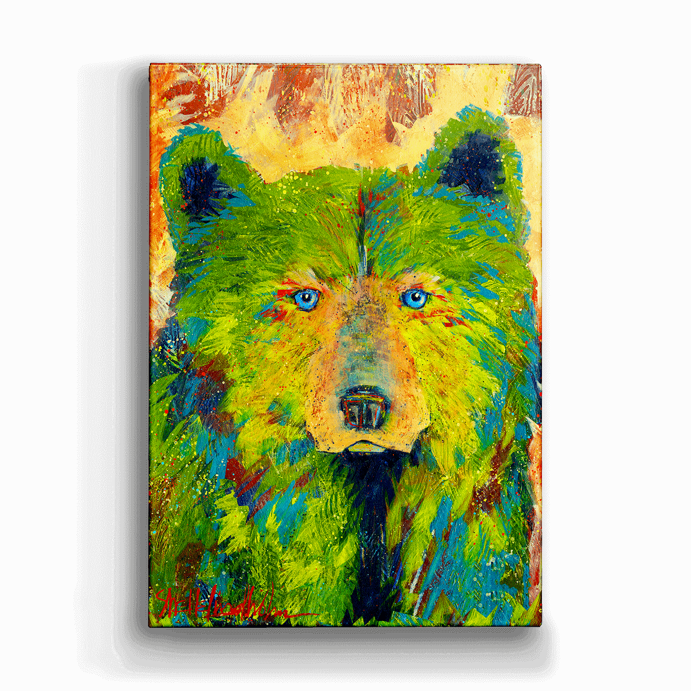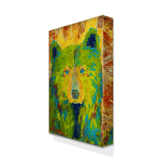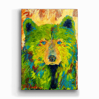 Embrace the wild with 'Fern,' a mesmerizing portrayal of a bear whose vibrant fur blooms with the lush colors of the forest. This captivating artwork is a vivid mosaic of greens, blues, and earth tones, layered with dynamic, expressive brushstrokes that evoke the dense foliage of ferns. The bear's intense blue eyes draw you into a world of natural mystery and beauty, making it a striking addition to any art collection or home decor.