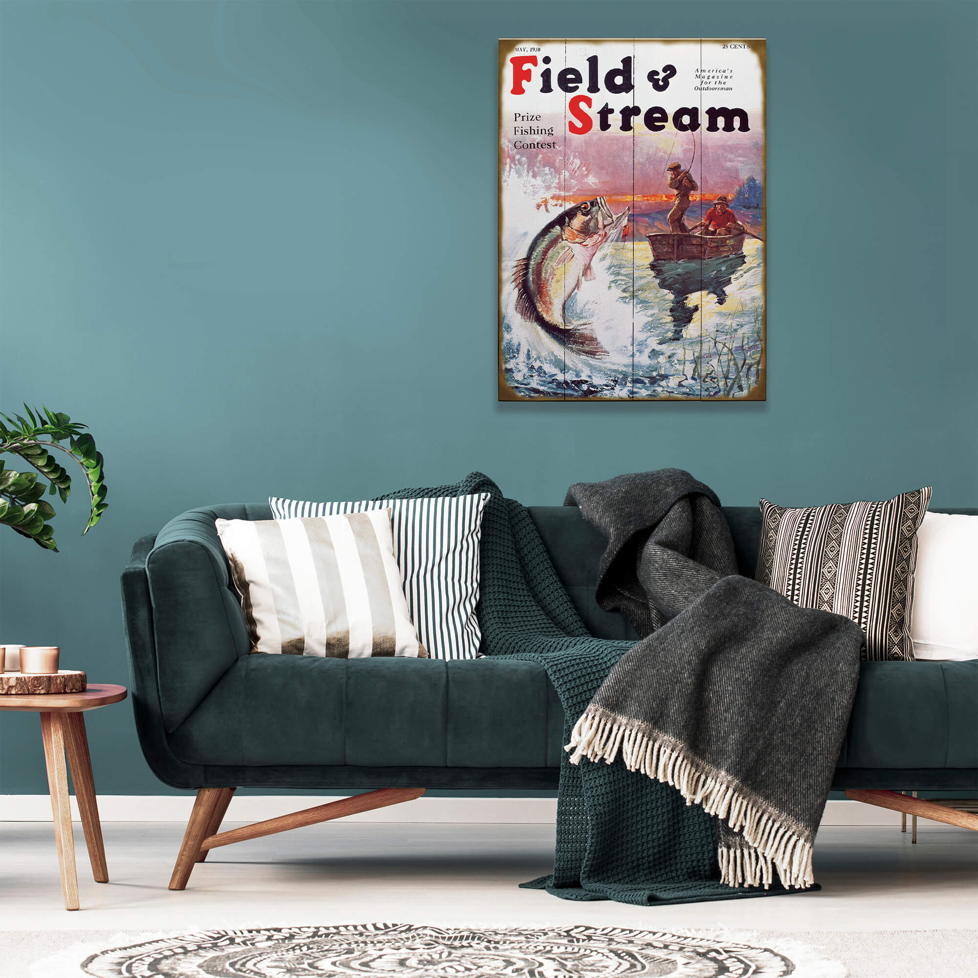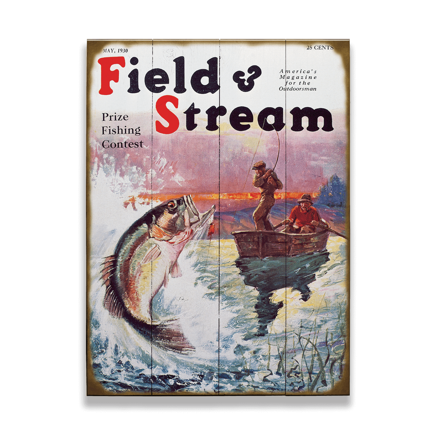 Feel the surge of a hard-fought battle in this Field and Stream cover from May 1930. A bass breaks through the water’s surface in a flash of spray, mid-leap, as an angler braces in the boat behind, rod bent and line tight. With warm evening light spilling across the lake, the scene captures everything that defines a great day on the water—skill, timing, and the electrifying moment when a prize catch comes to life. A perfect tribute to classic fishing adventures and the thrill that keeps anglers casting.